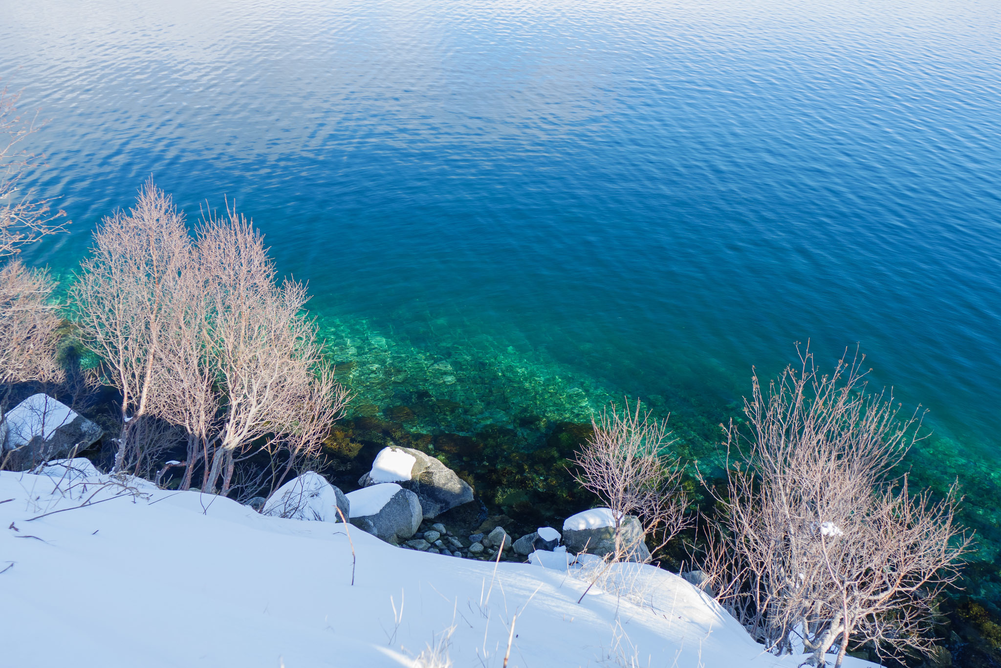 Nous poursuivons notre chemin vers la plage de Sandviksletta. Il y a quelques mètres qui séparent le parking de la plage et nous marchons dans la neige pour y arriver. Il a beaucoup neigé ici aussi et on est ensevelis par endroit jusqu’aux genoux !