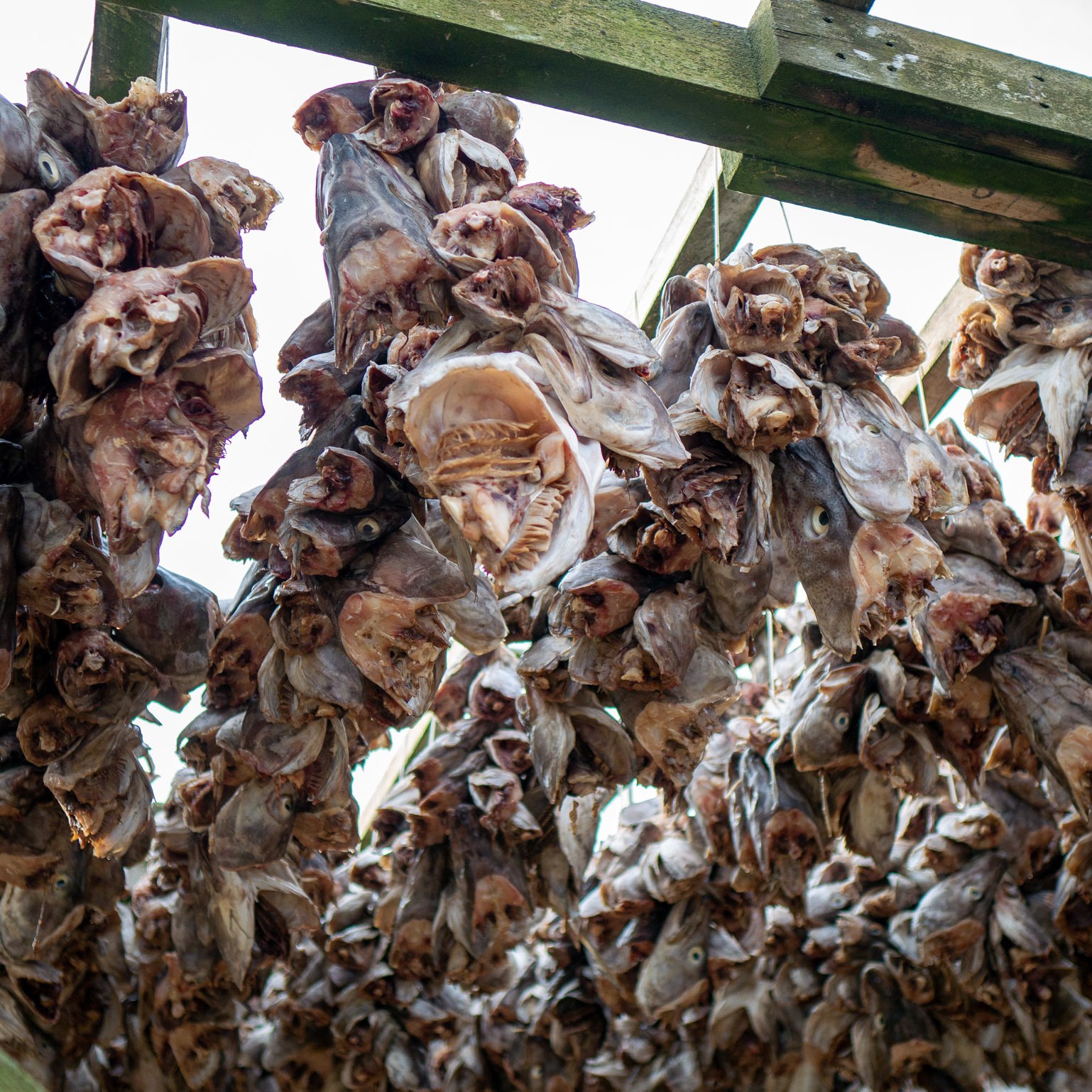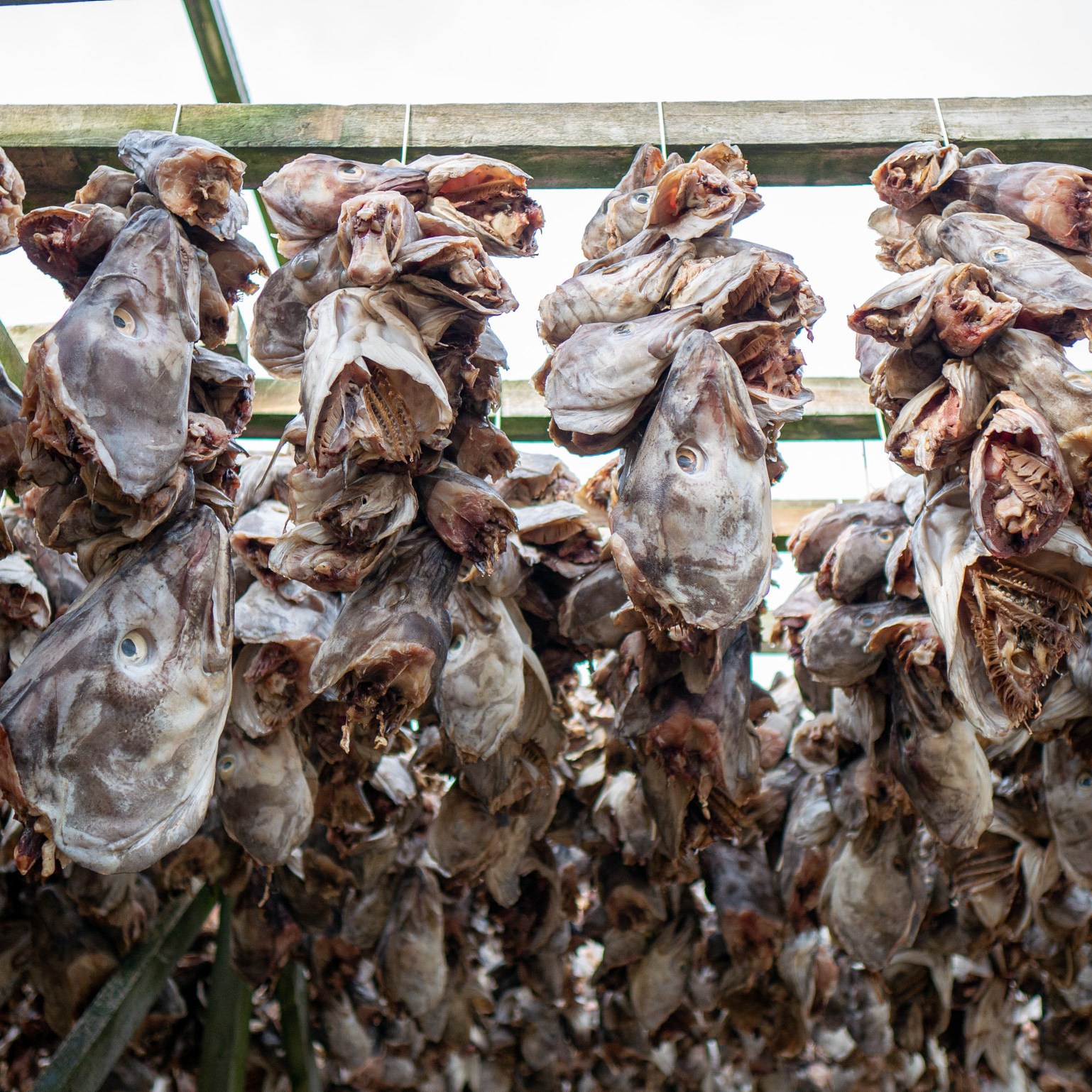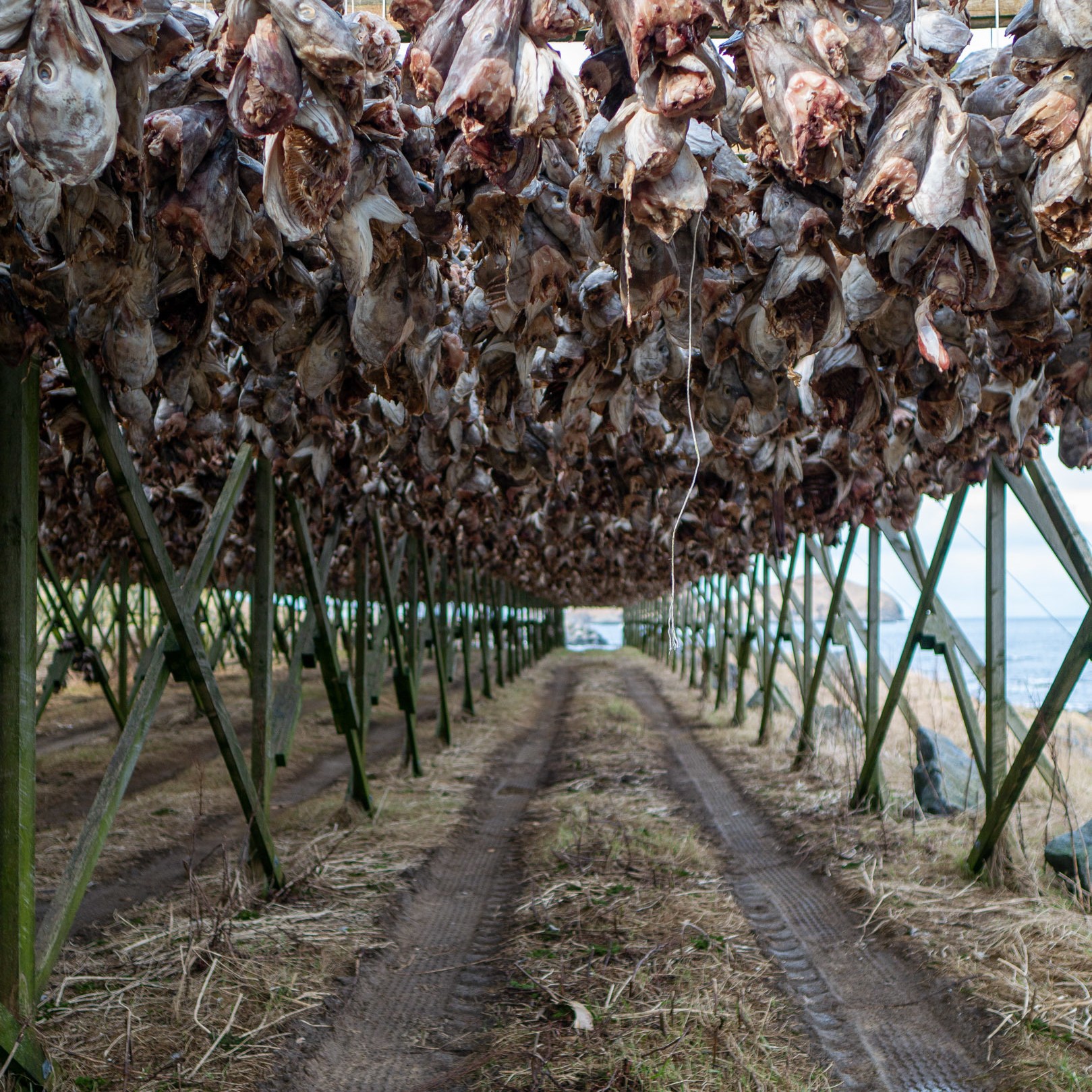 Cette tradition ancestrale consiste à faire sécher du poisson éviscéré et décapité pendant 4 mois. De février à mai, le poisson sèche un peu partout dans ce secteur de la Norvège, que cela soit à grande échelle comme ici ou le long des façades des maisons. 4 longs mois à sécher au vent, sous les intempéries, avec les embruns de la mer qui s’y déposent. On nous a toujours dit qu’il ne fallait jamais recongeler un produit décongelé et on a un peu de mal à comprendre comment il est possible que quelque chose soit comestible après avoir vécu 4 mois dans les aléas climatiques et avec des variations de températures parfois importantes. Ma foi, ça ne doit pas être si dangereux que ça, vu que nous avons mangé du stockfish à plusieurs reprises et que nous sommes toujours vivants 9 mois plus tard =)