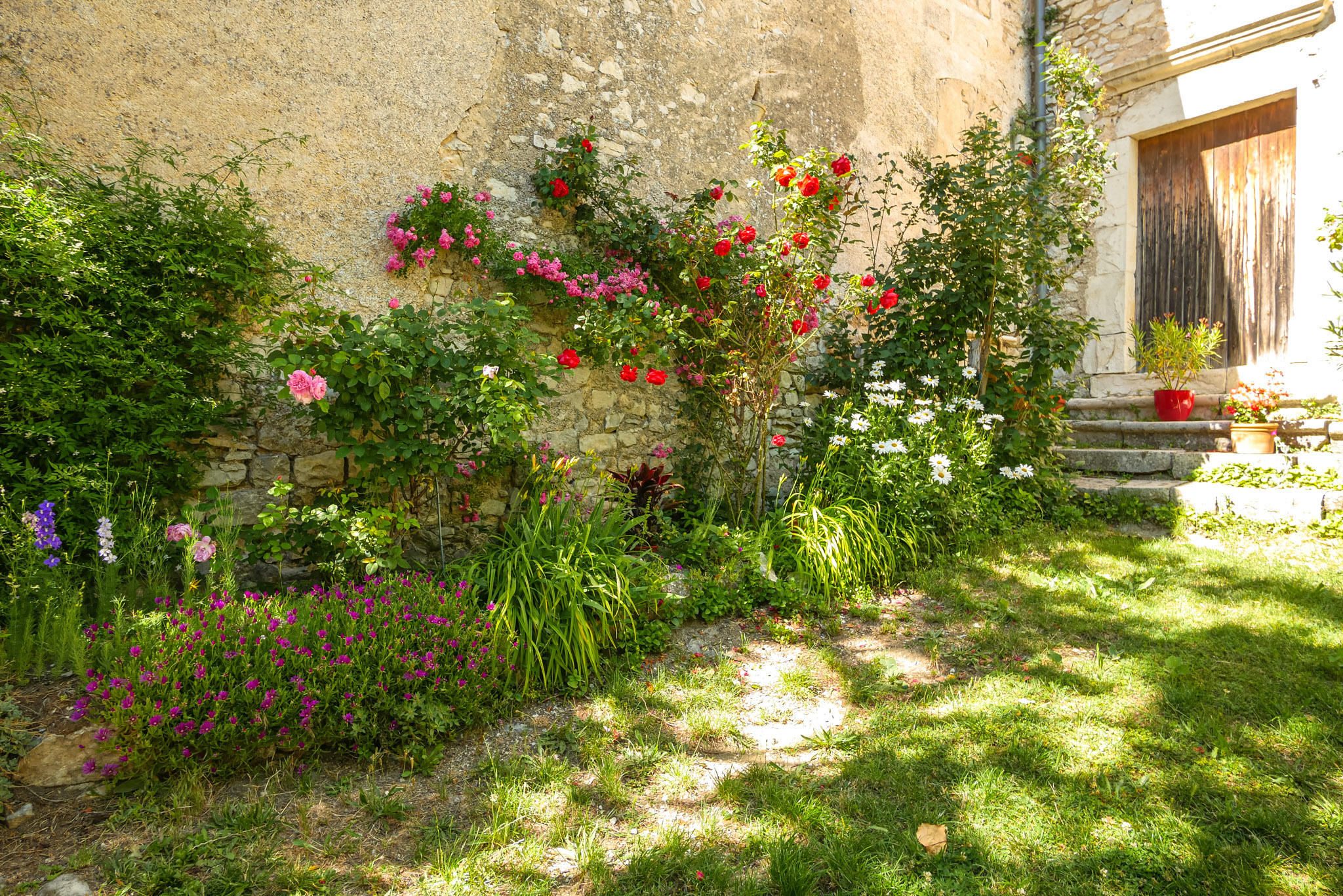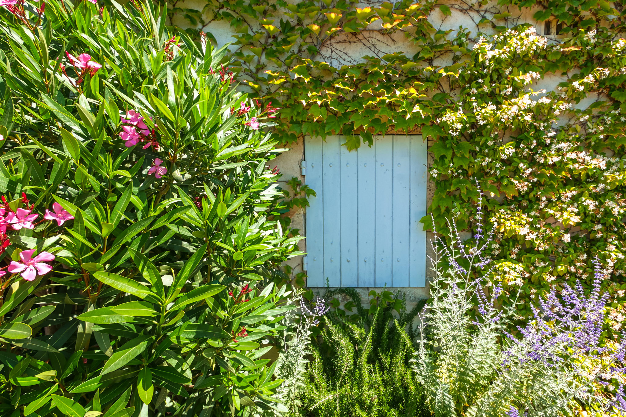 Un joli laurier rose apporte une touche de peps dans cette ruelle toute en pierre