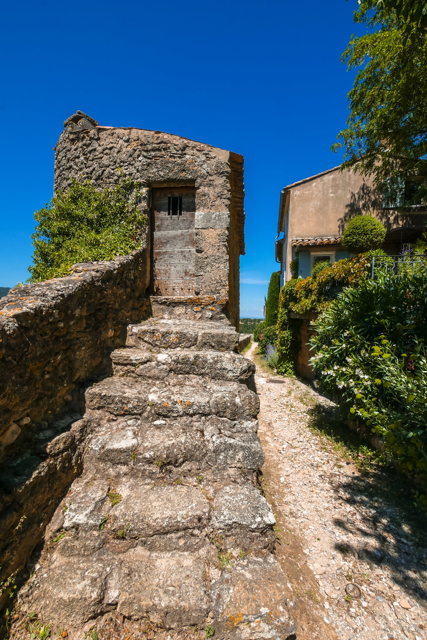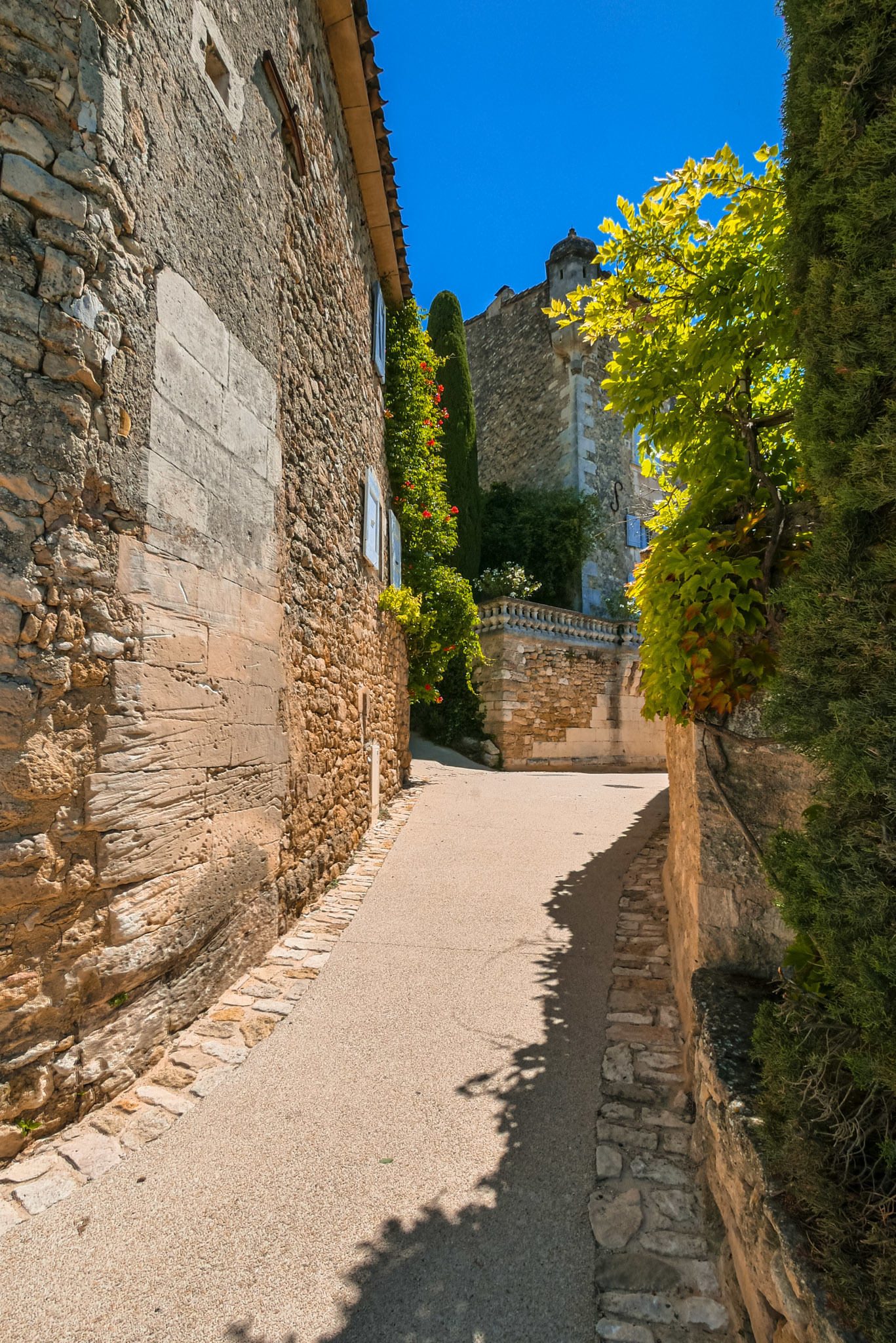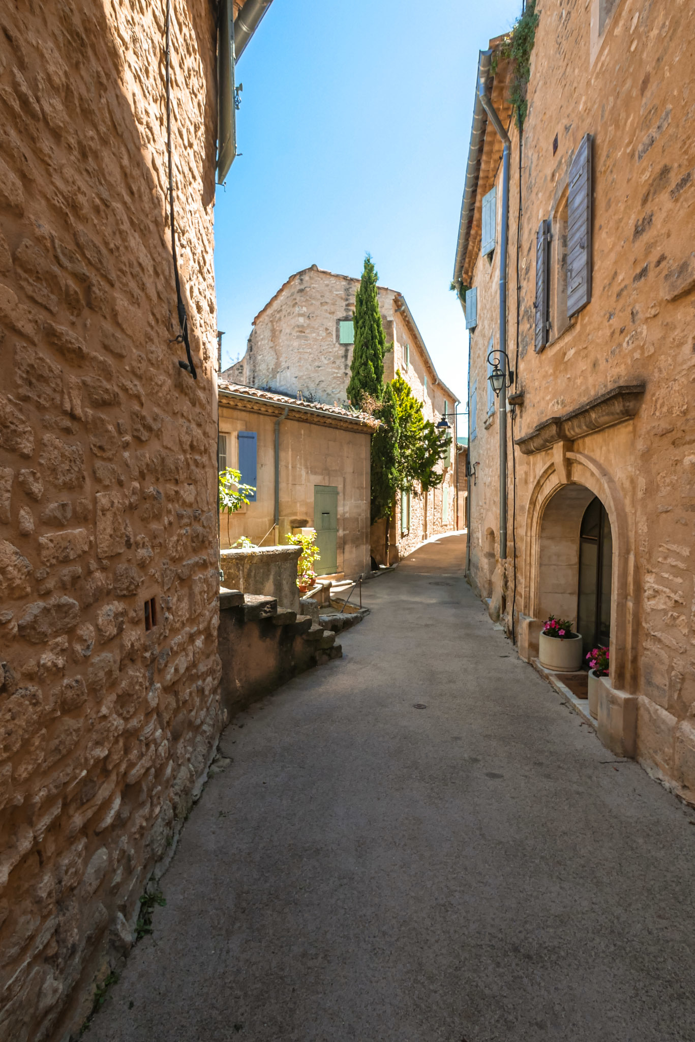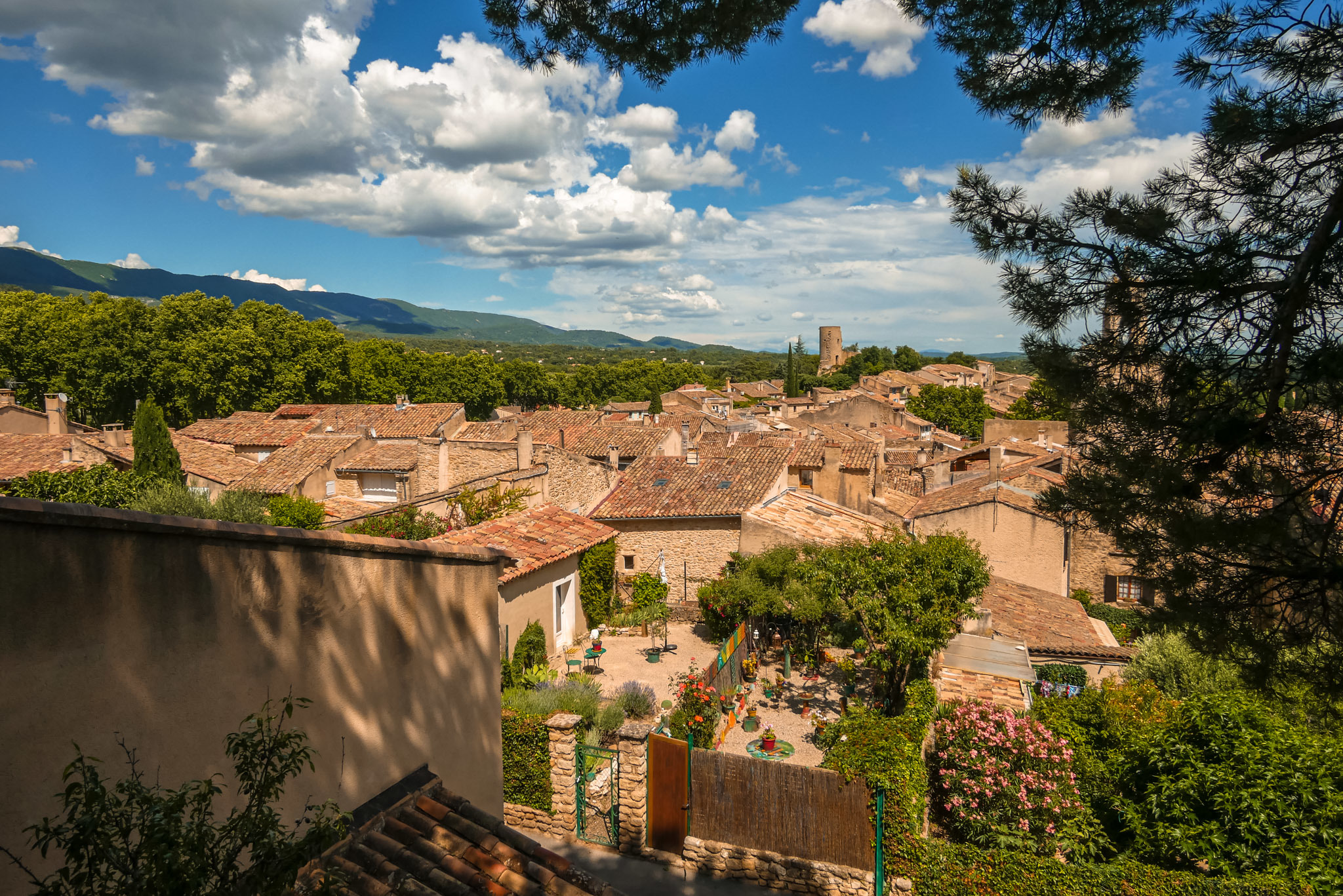 Lorsque vous montez dans les ruelles supérieures du village, n’oubliez pas de jeter un œil au village en contrebas. On distingue au loin, par beau temps, le Mont Ventoux et tout le massif du Luberon.