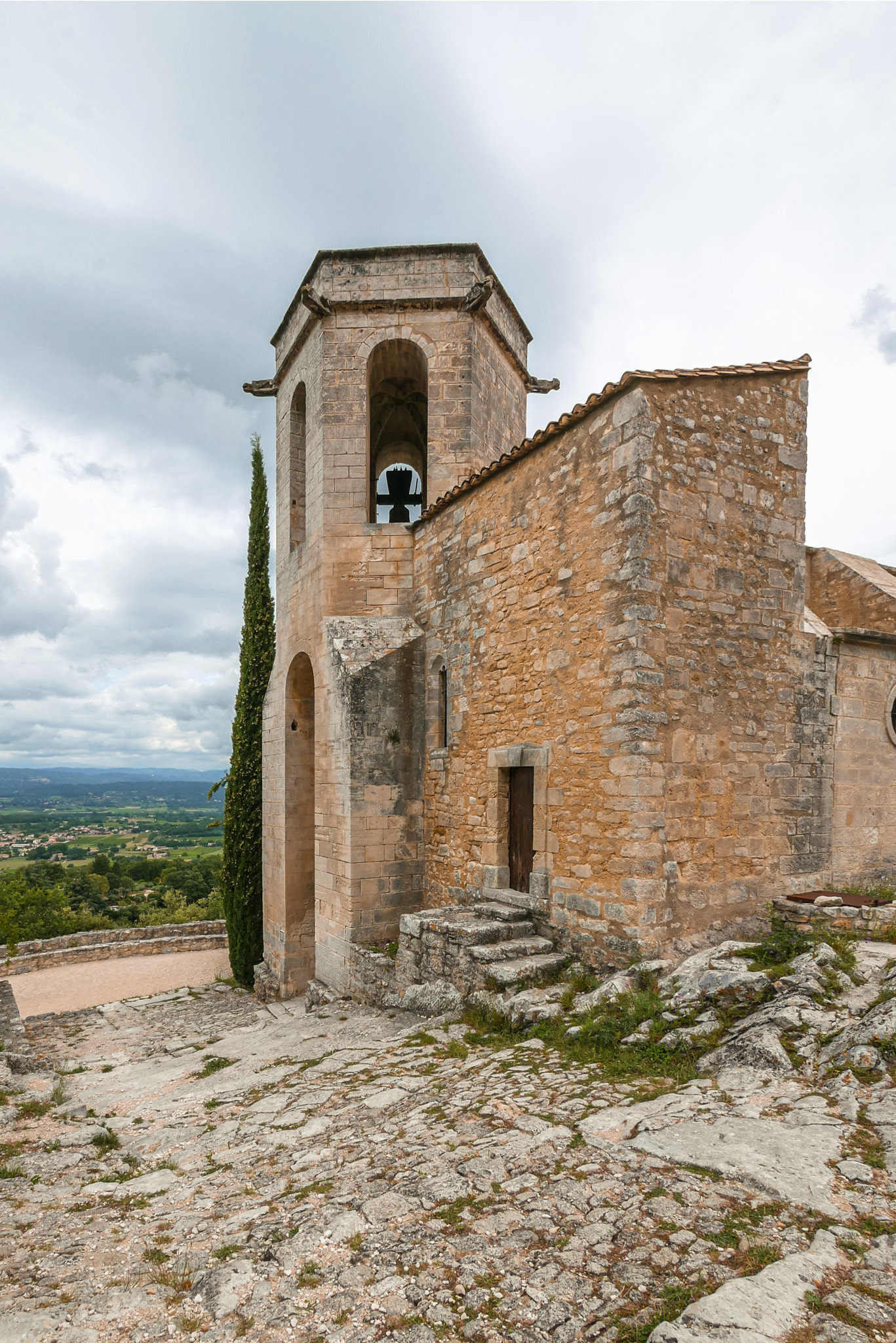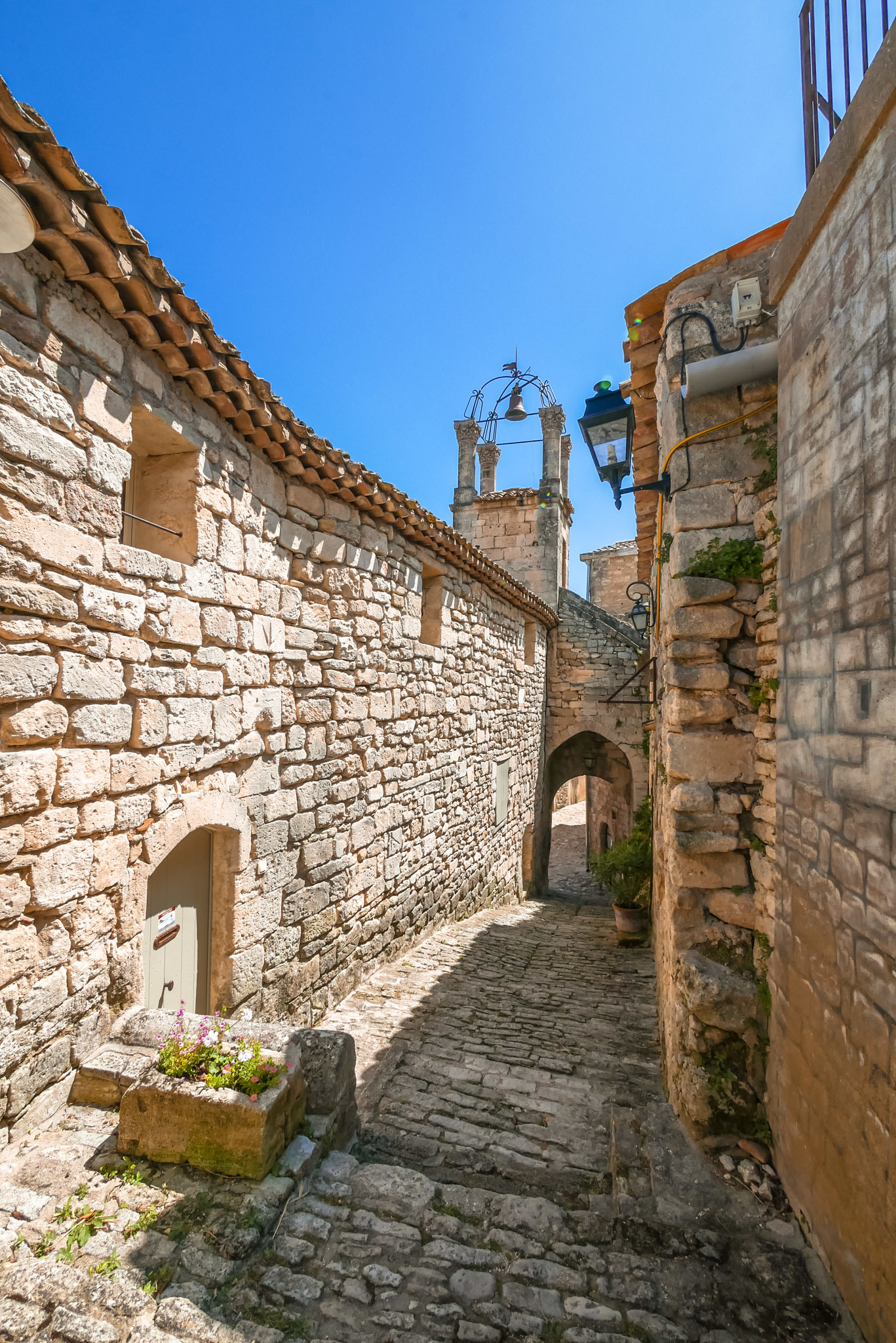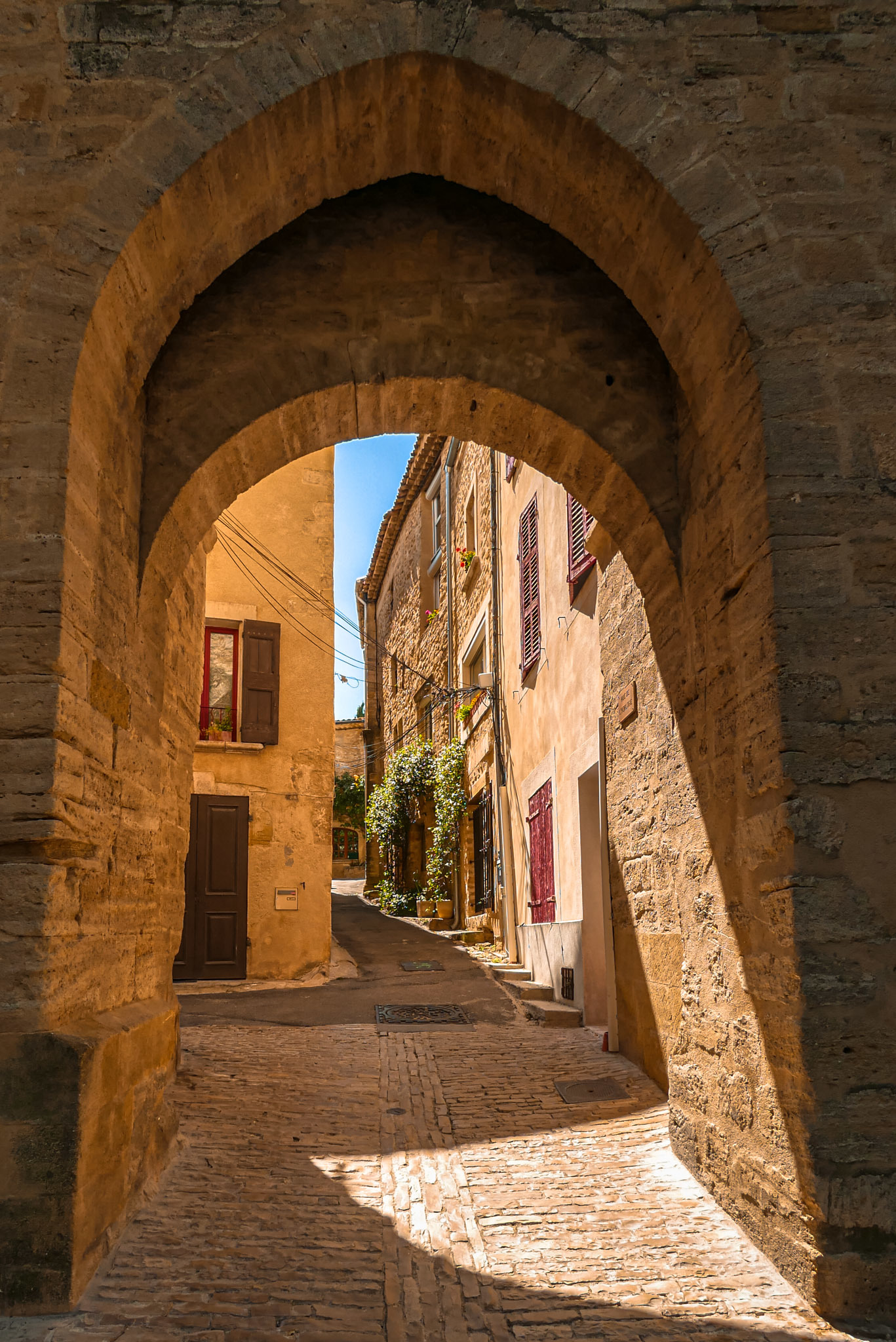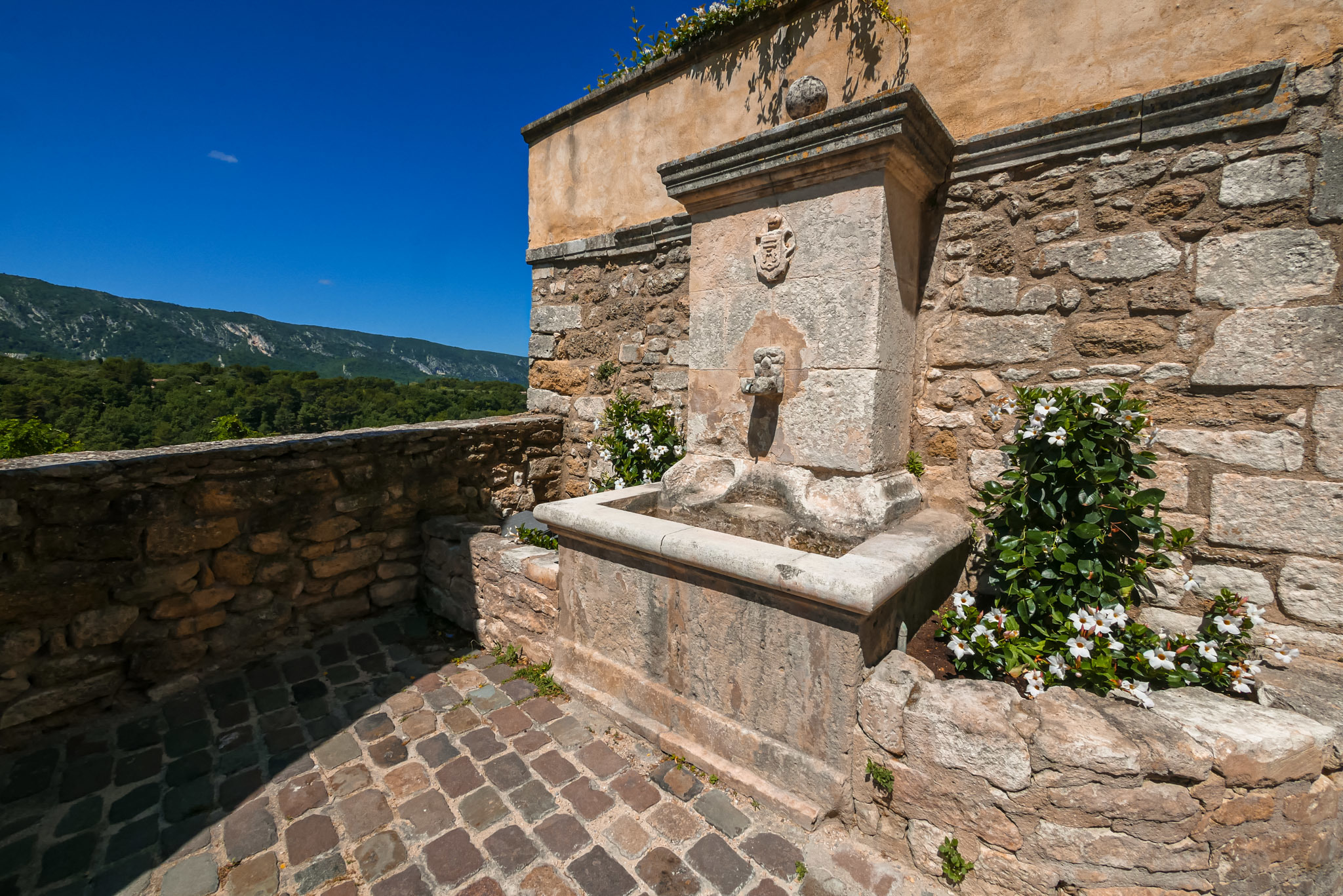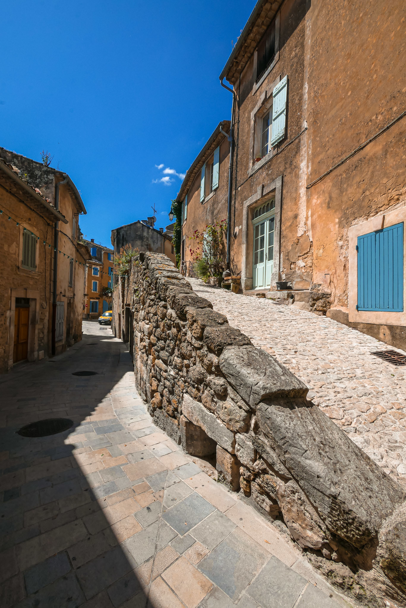 Lorsque vous montez dans les ruelles supérieures du village, n’oubliez pas de jeter un œil au village en contrebas. On distingue au loin, par beau temps, le Mont Ventoux et tout le massif du Luberon.