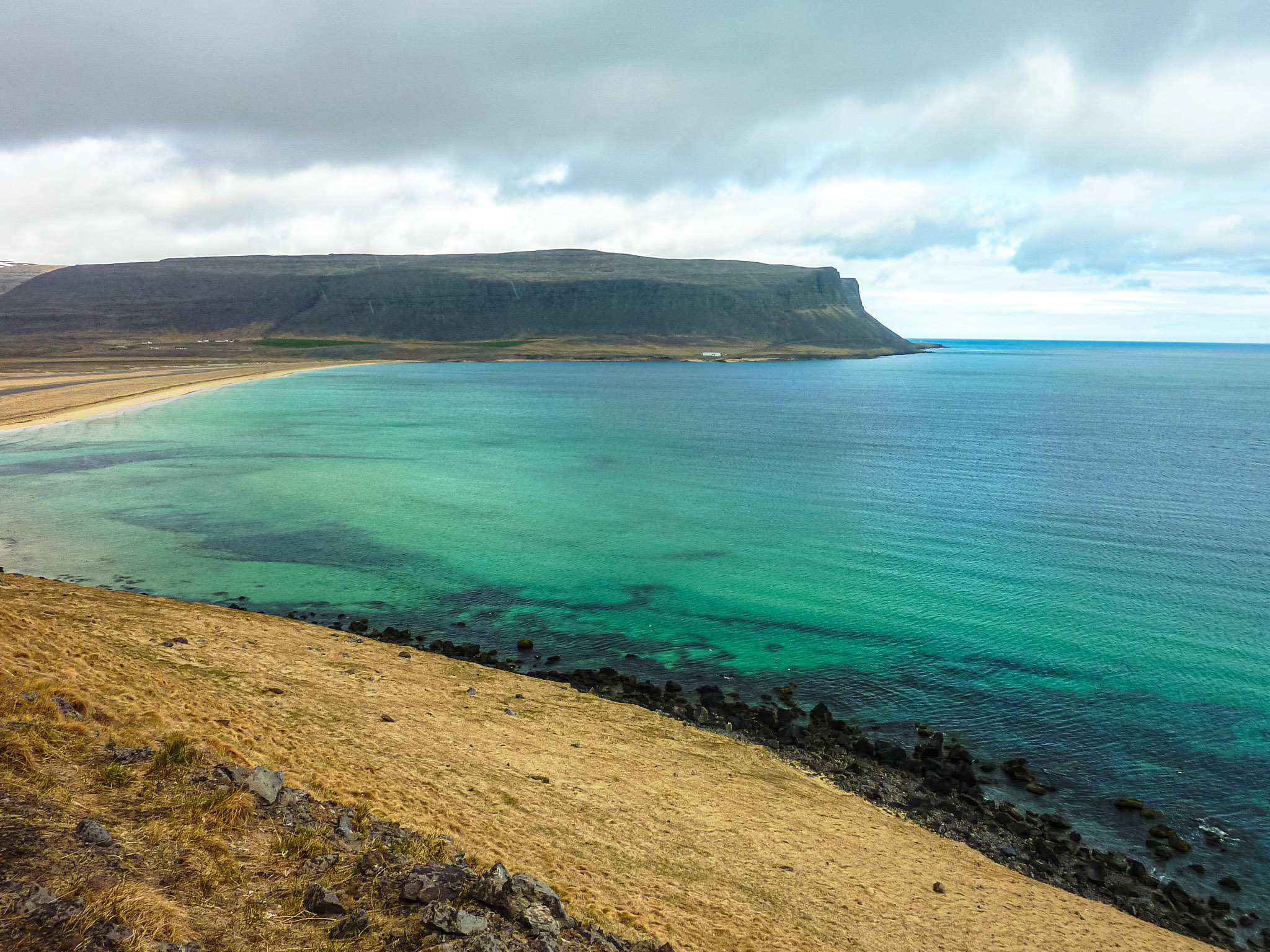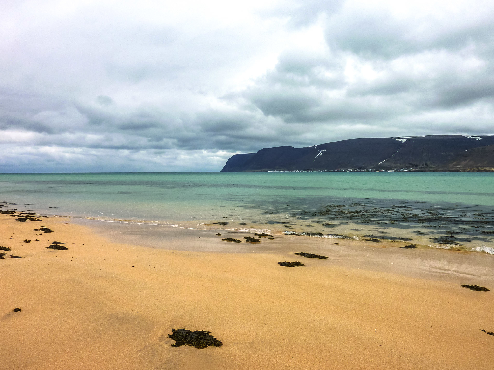 Elle n’en reste pas moins une plage très photogénique avec son long banc de sable, son eau translucide même sous les nuages et les hauteurs du fjord en face.