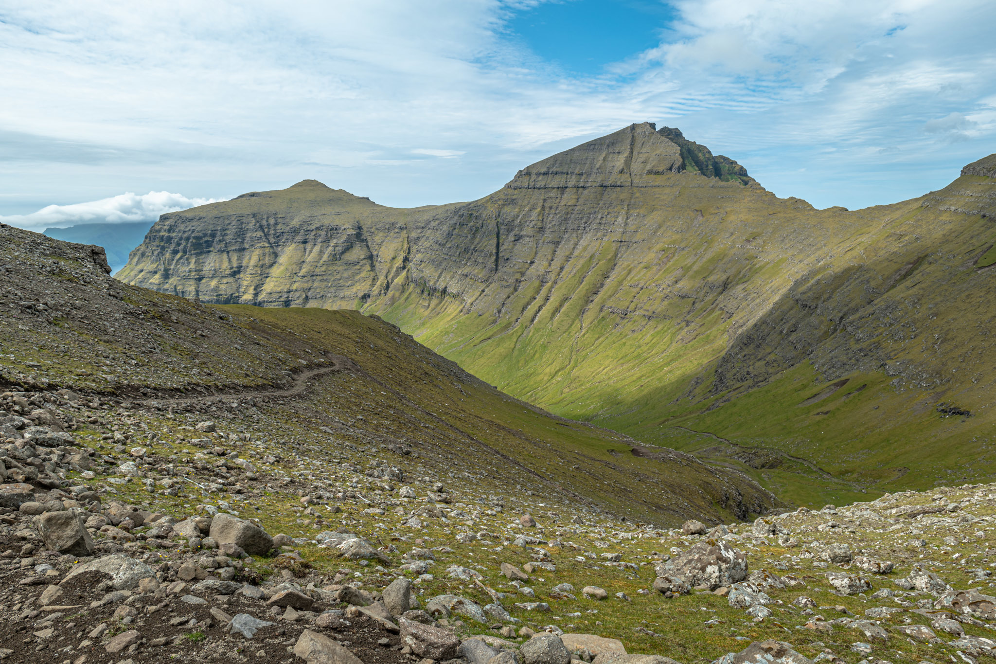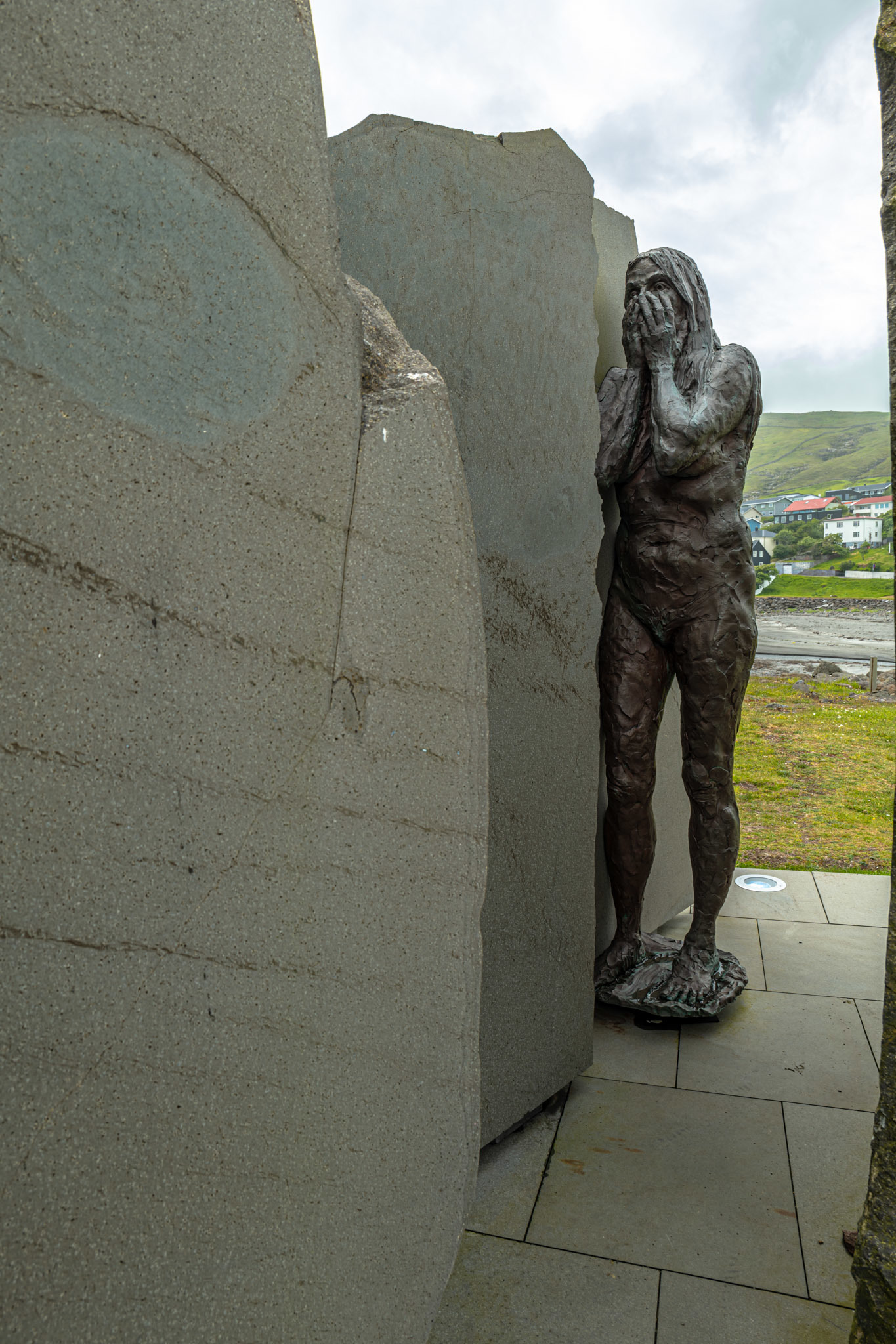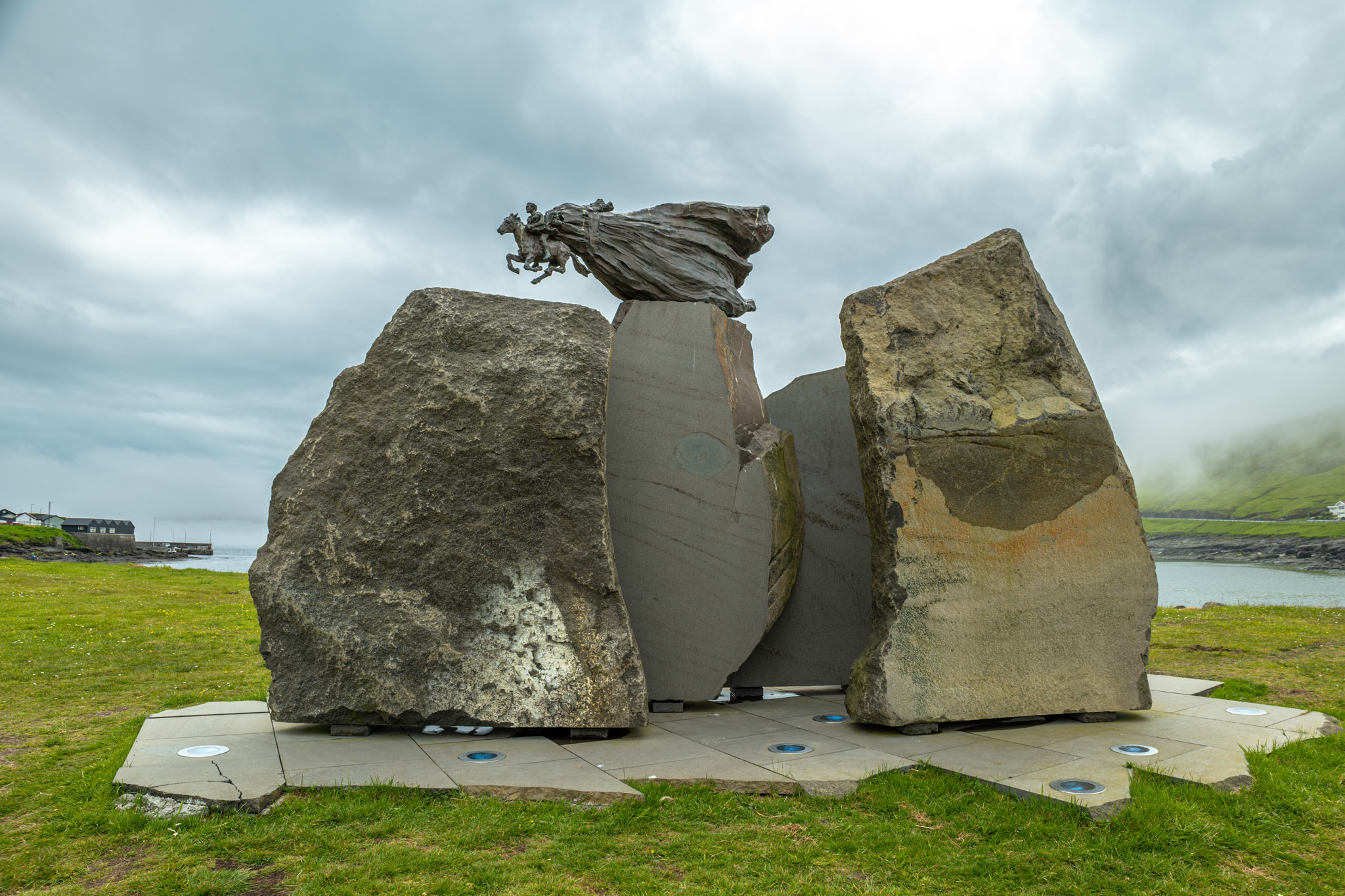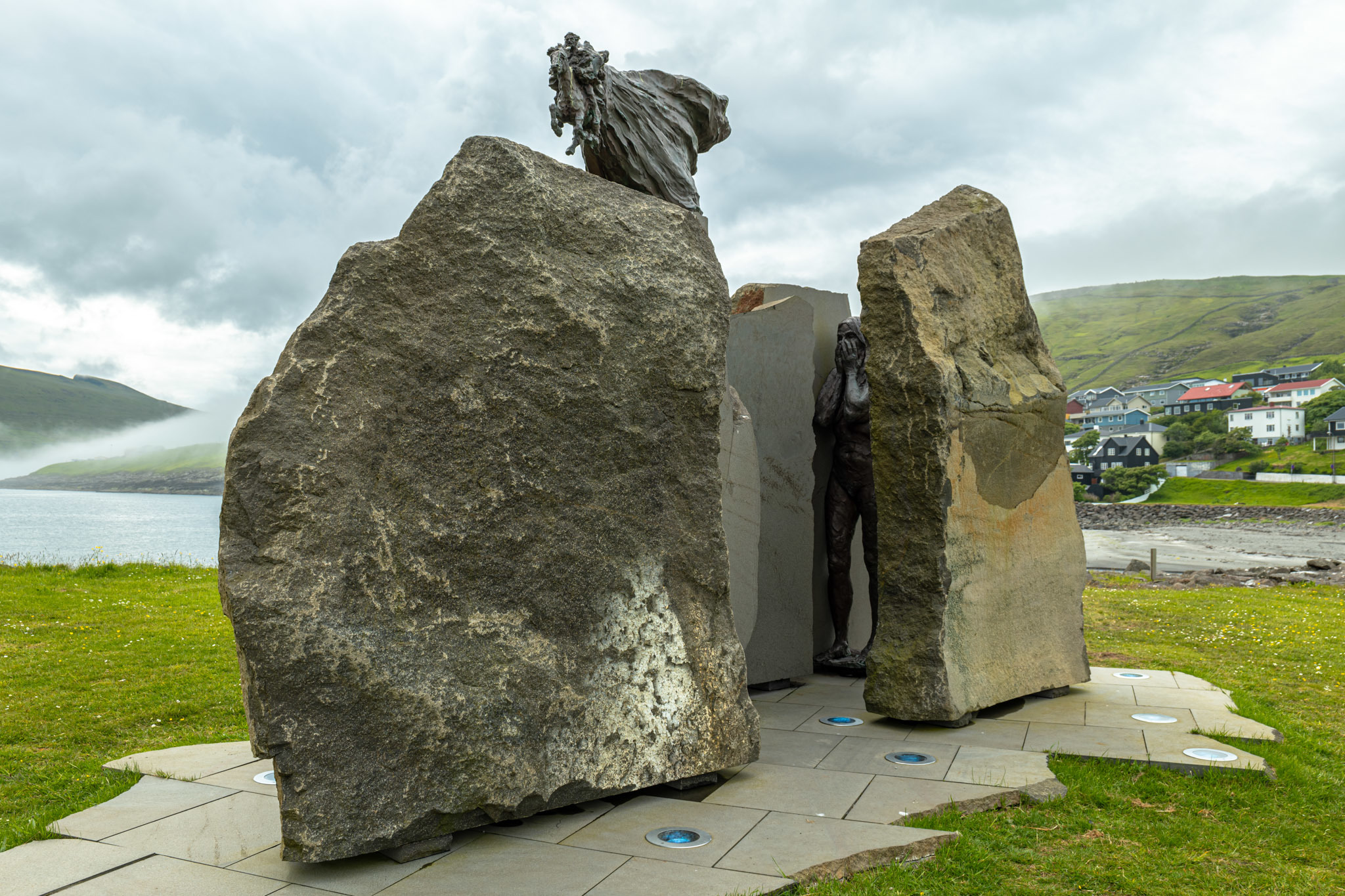La légende raconte qu’une sorcière originaire des Féroé voulait se rendre en Islande, mais que le soleil l’a pétrifiée et l’a transformée en pierre. Elle était si grande qu’en tombant, sa tête a fini dans l’océan et est devenue cette île, Koltur, qu’on aperçoit un peu plus loin la tête dans les nuages.