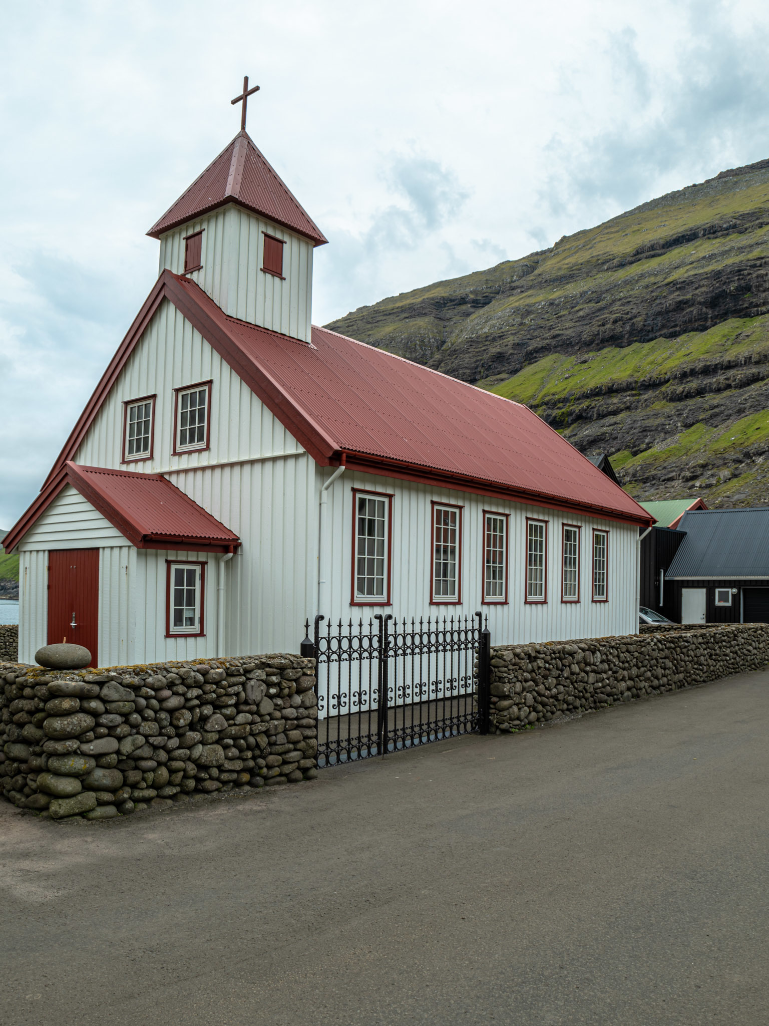 Bøur est un peu le cliché du parfait village des Féroé : les petites maisons noires et colorées typiquement féroïennes, l’église en plein cœur, la vue sur la rive opposée avec ses fjords… On aperçoit parfaitement, par temps clair, l’île de Tindhólmur, l’arche de Drangarnir…