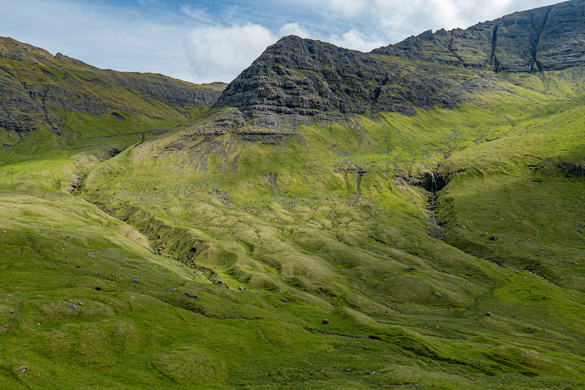Les multiples cascades à l’arrière de Tjørnuvík donnent un charme exceptionnel au village. Même lorsque l’eau ne coule pas beaucoup en raison du temps sec comme ça a été le cas lorsque nous y étions.