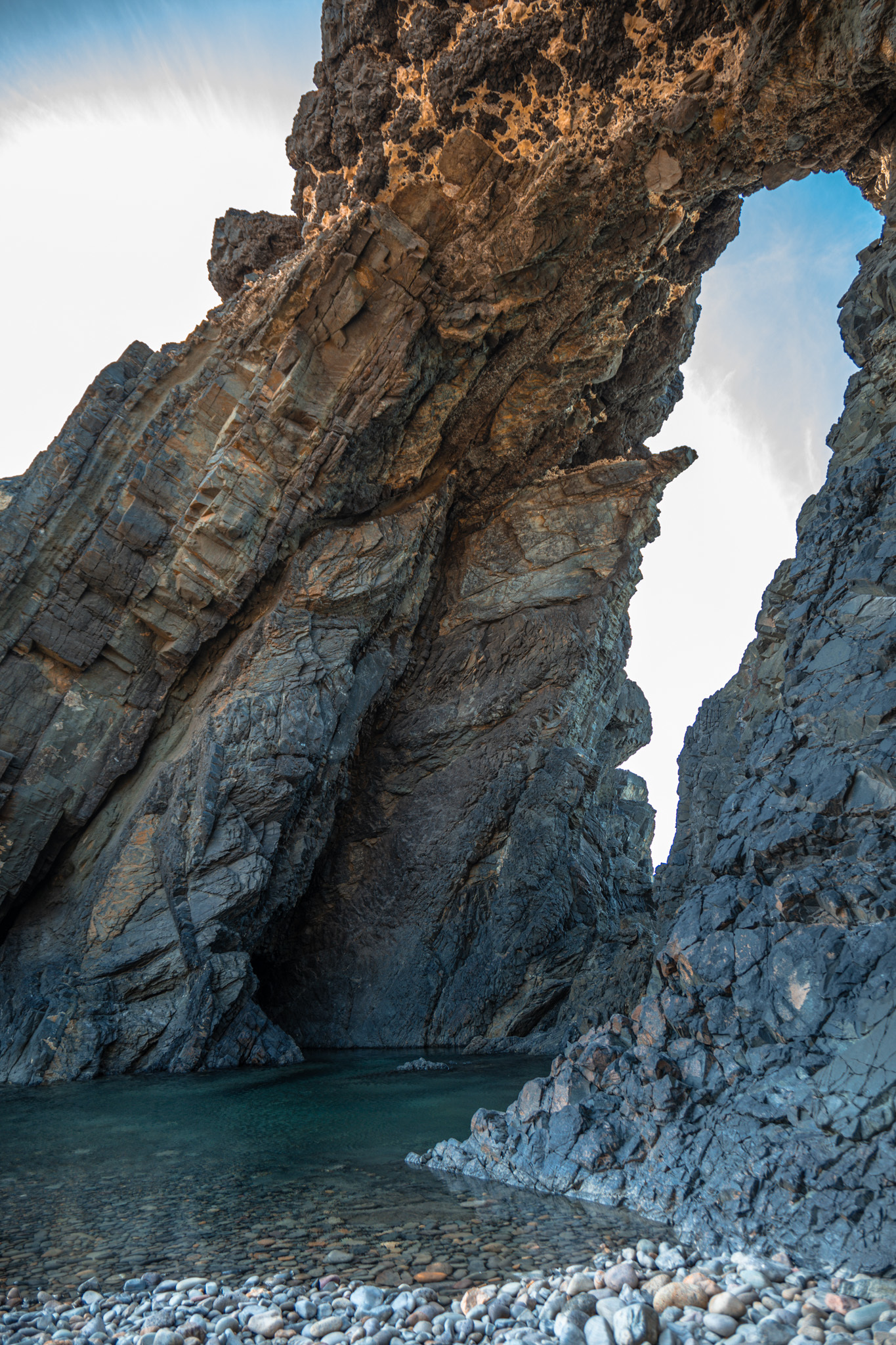 Ce rocher immense en bord de mer possède un trou béant qui laisse entrevoir la mer derrière.
