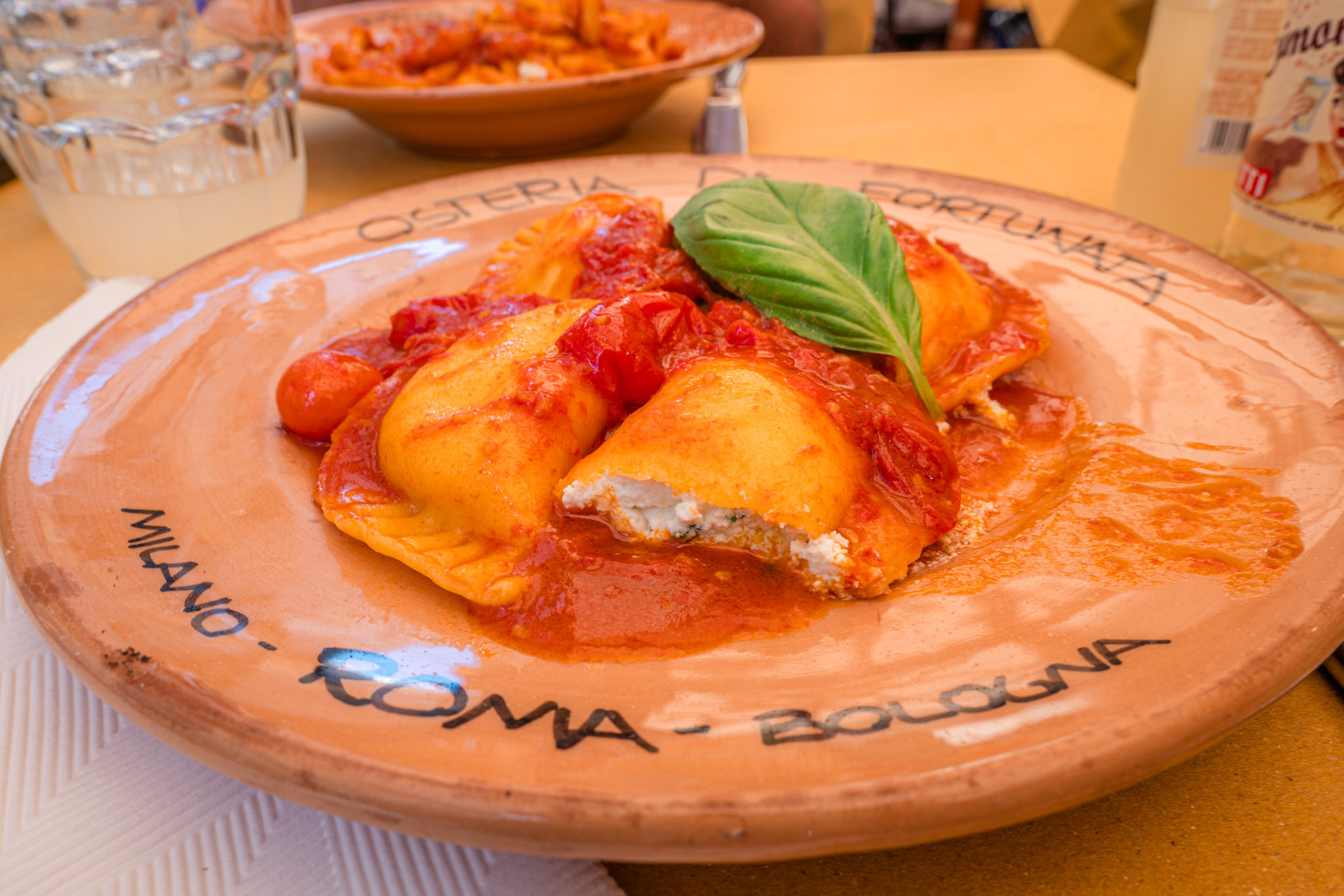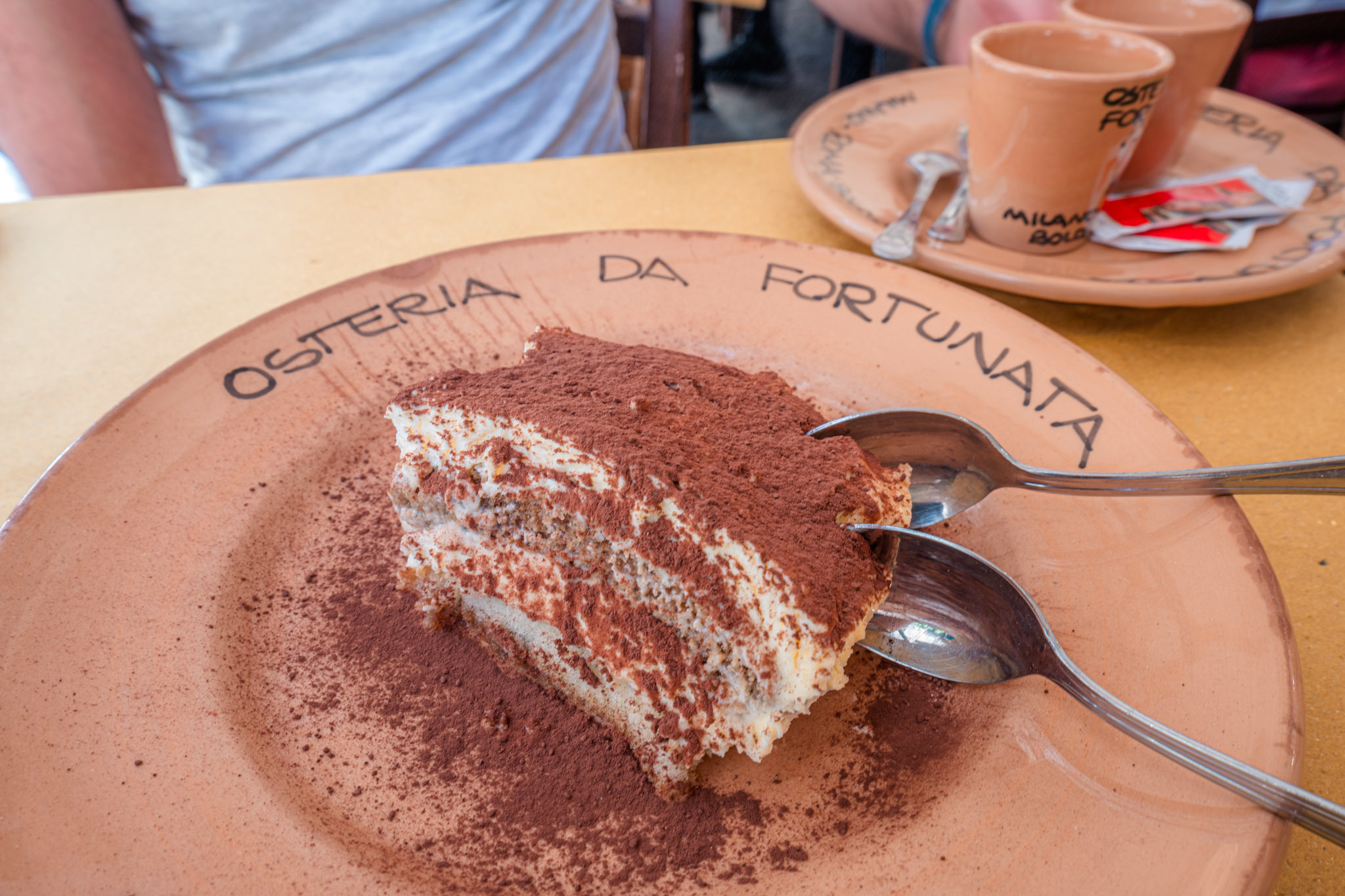C’est là que je reçois un message « t’es où ? ». Je partage ma position avec le Viking qui me répond « j’arrive d’ici 15min ». Parfait ! Je lui dis que j’ai trouvé un bon petit restau, Osteria Da Fortunata, (histoire de le rendre de meilleure humeur que quand je l’ai laissé un peu plus d’une heure avant), je fais la file dehors en plein cagnard et dès qu’il arrive, on nous installe sur la terrasse. Le Viking retrouve son sourire et sa bonne humeur devant le plat de pâte qui arrive (et en plus, les pâtes sont faites à la main devant nous !) et la part de tiramisu. Le top !