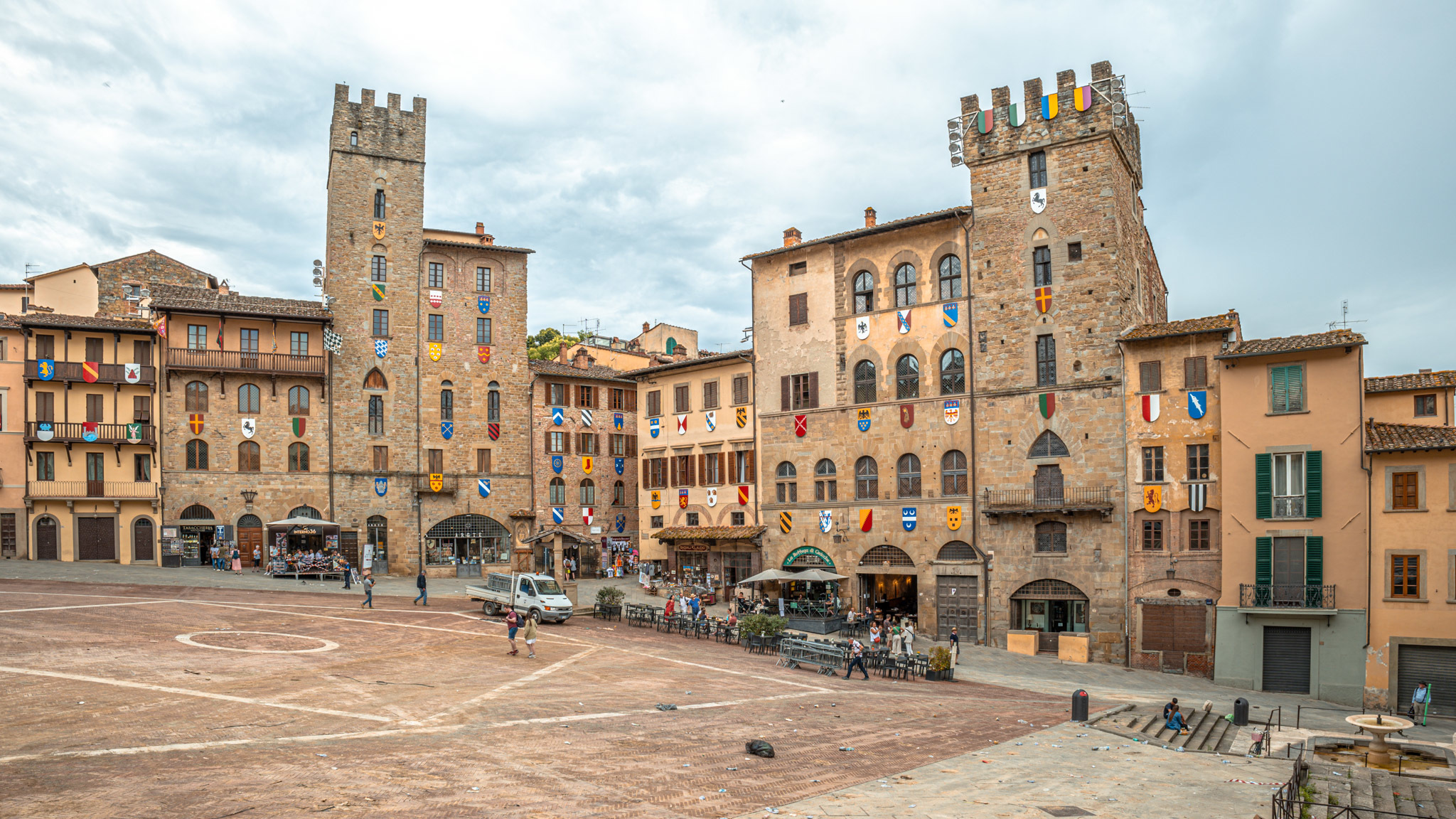 On va à Arezzo en grande partie pour sa célèbre place, la Piazza Grande, et son architecture médiévale. C’est vrai que c’est super chouette, avec tous les blasons de la ville accrochés en devanture.