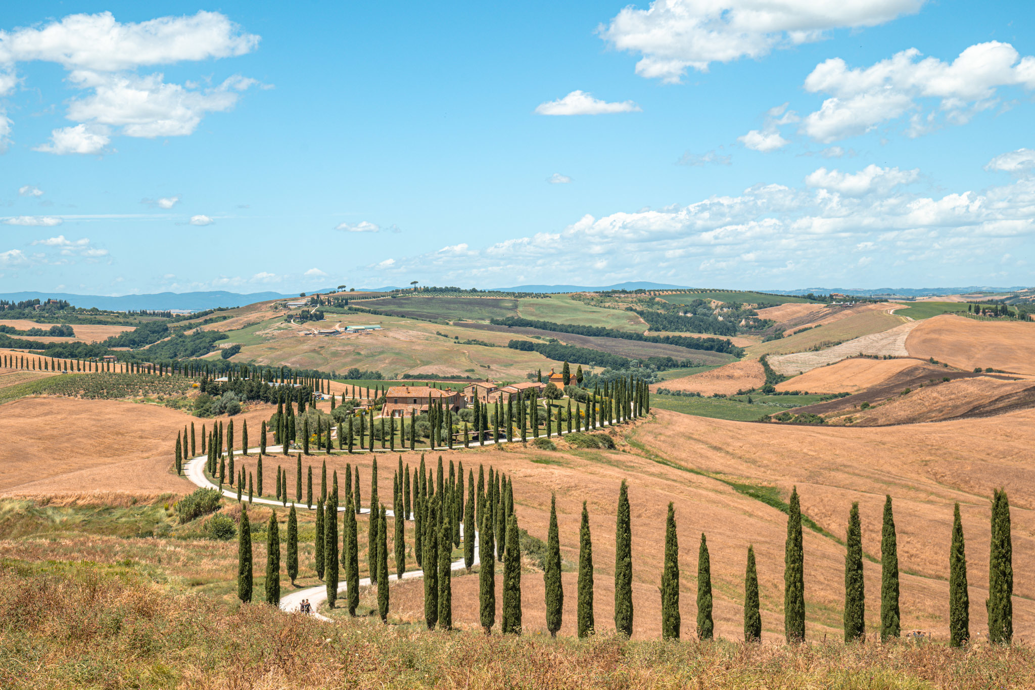 Quiconque se sera un jour intéressé à la Toscane aura déjà vu une photo des crètes de Senesi, ponctuées d’allées de cyprès. Les plus célèbres sont celles prises à l’entrée de l’hôtel Baccoleno. Cette allée est privée, et vous ne pourrez y accéder que si vous avez une réservation dans l’établissement. Néanmoins, vous pouvez vous arrêter sur le bord de la route non loin de là et marcher à travers les champs jusqu’à trouver le point de vue adapté.