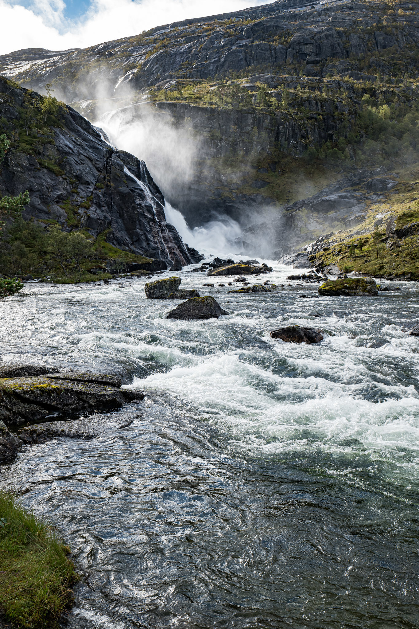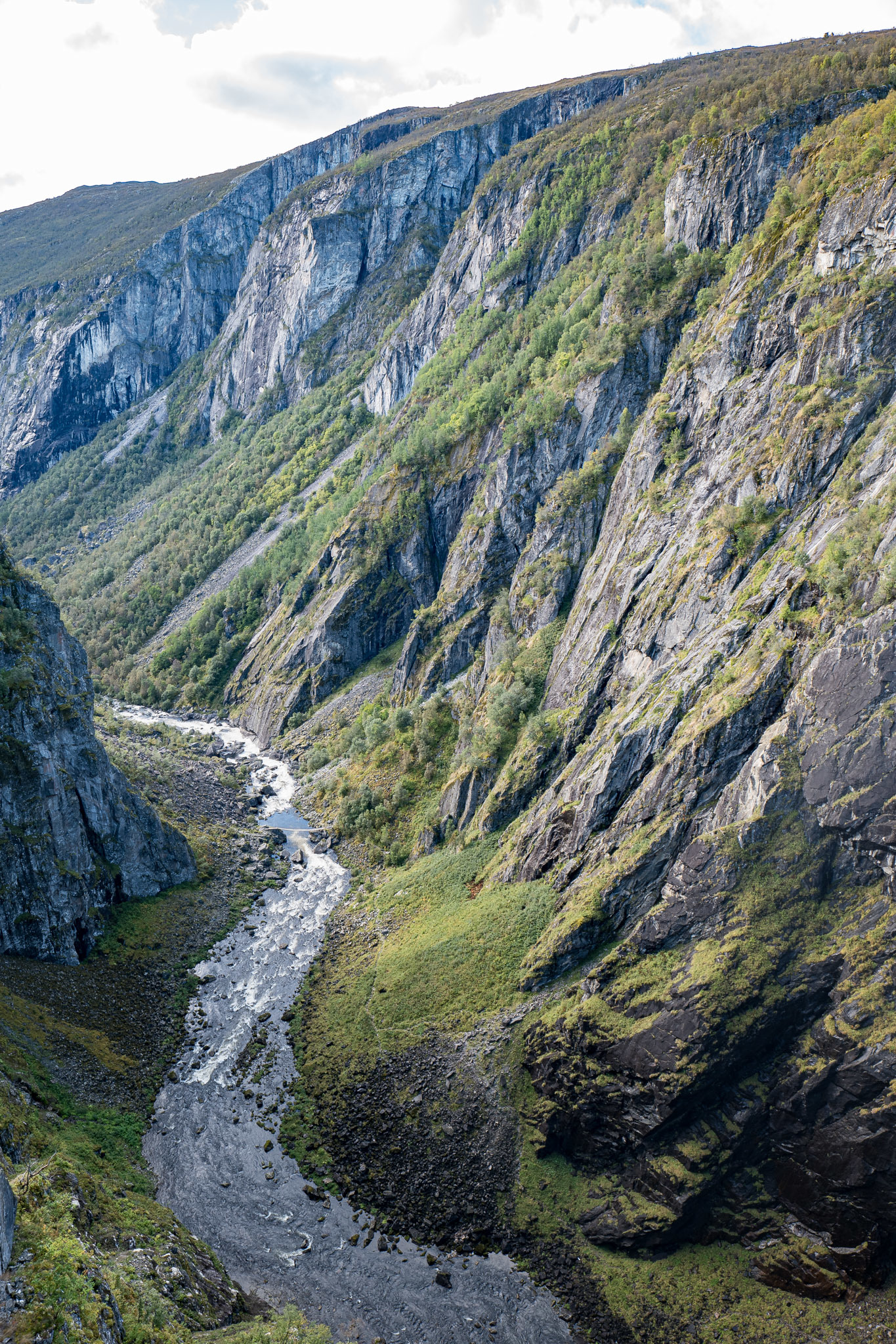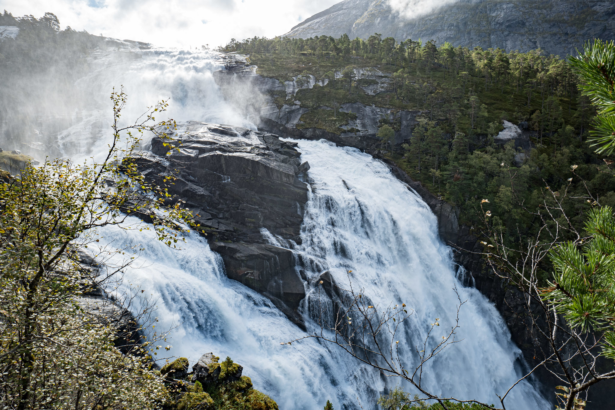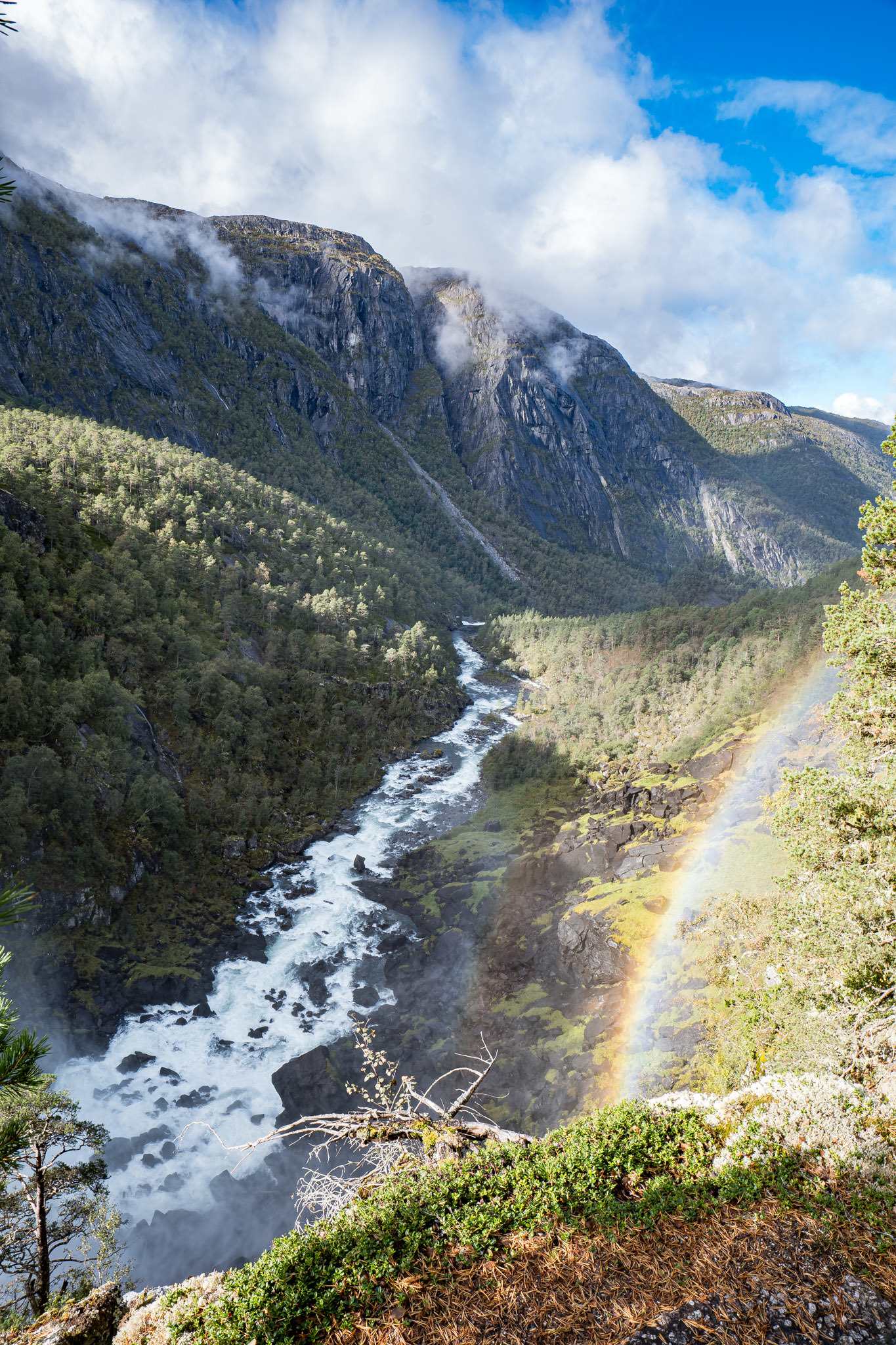 La cascade quant à elle est une des plus hautes de Norvège. Bien qu’elle ne soit pas très large, nous avons été subjugués par ce secteur. Nous restons une bonne heure sur place à parcourir toute la passerelle, avec un joli ciel dramatique comme j’aime ! Parfois les images suffisent à elles-mêmes et il n’y a pas besoin de broder de blabla inutile… La preuve !