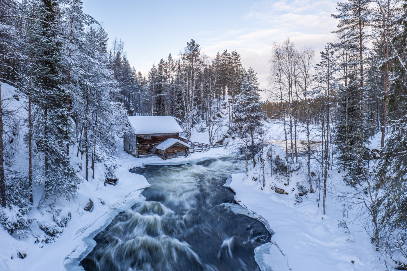 Notre but premier était d’aller photographier un des points de vue les plus célèbres de Laponie, le moulin de Mylikosky et ses ponts suspendus aux alentours, et le second était de partir randonner dans la neige toute la journée afin de profiter du soleil qui nous fait le cadeau d’être là depuis le début de notre séjour.