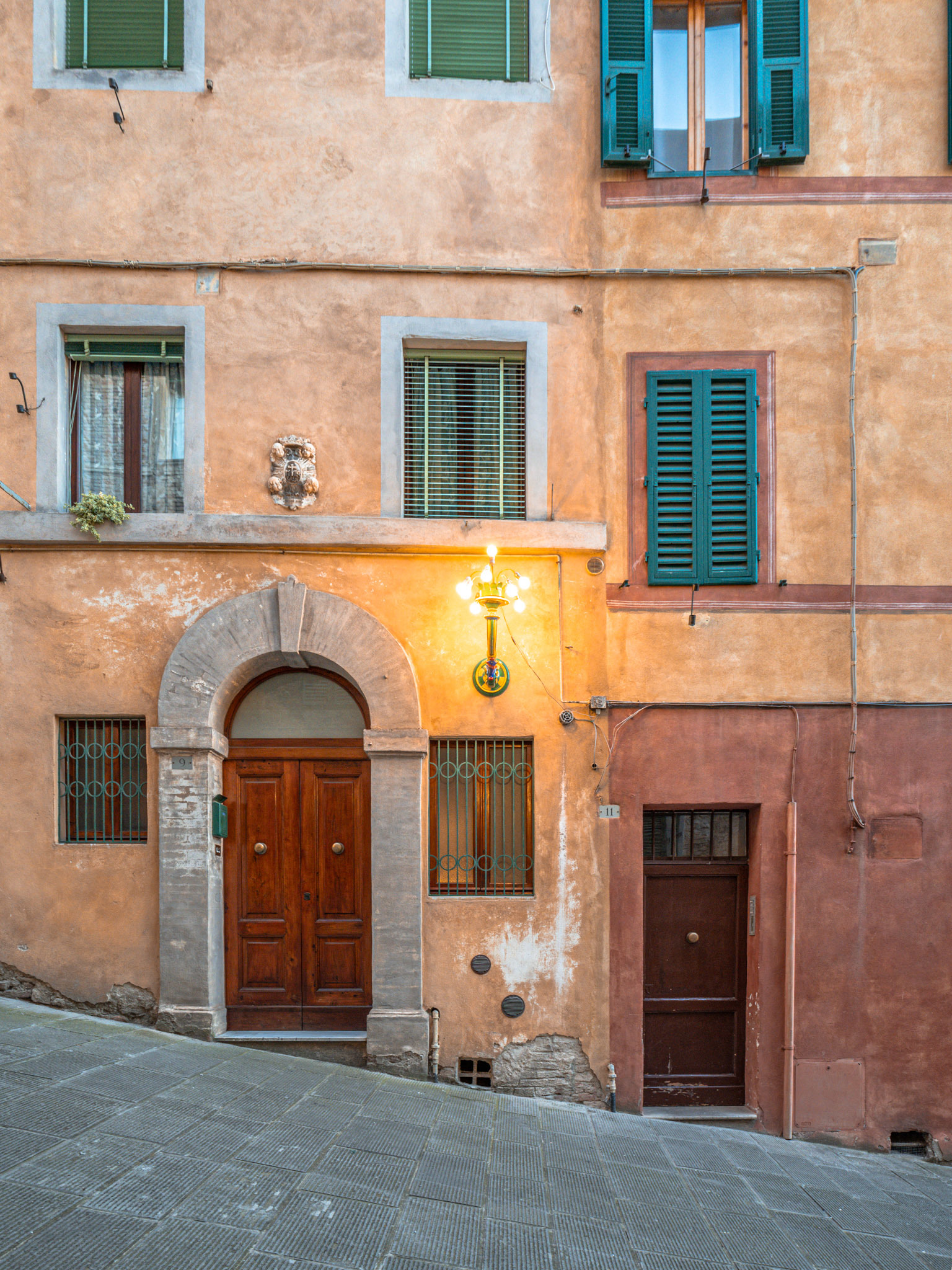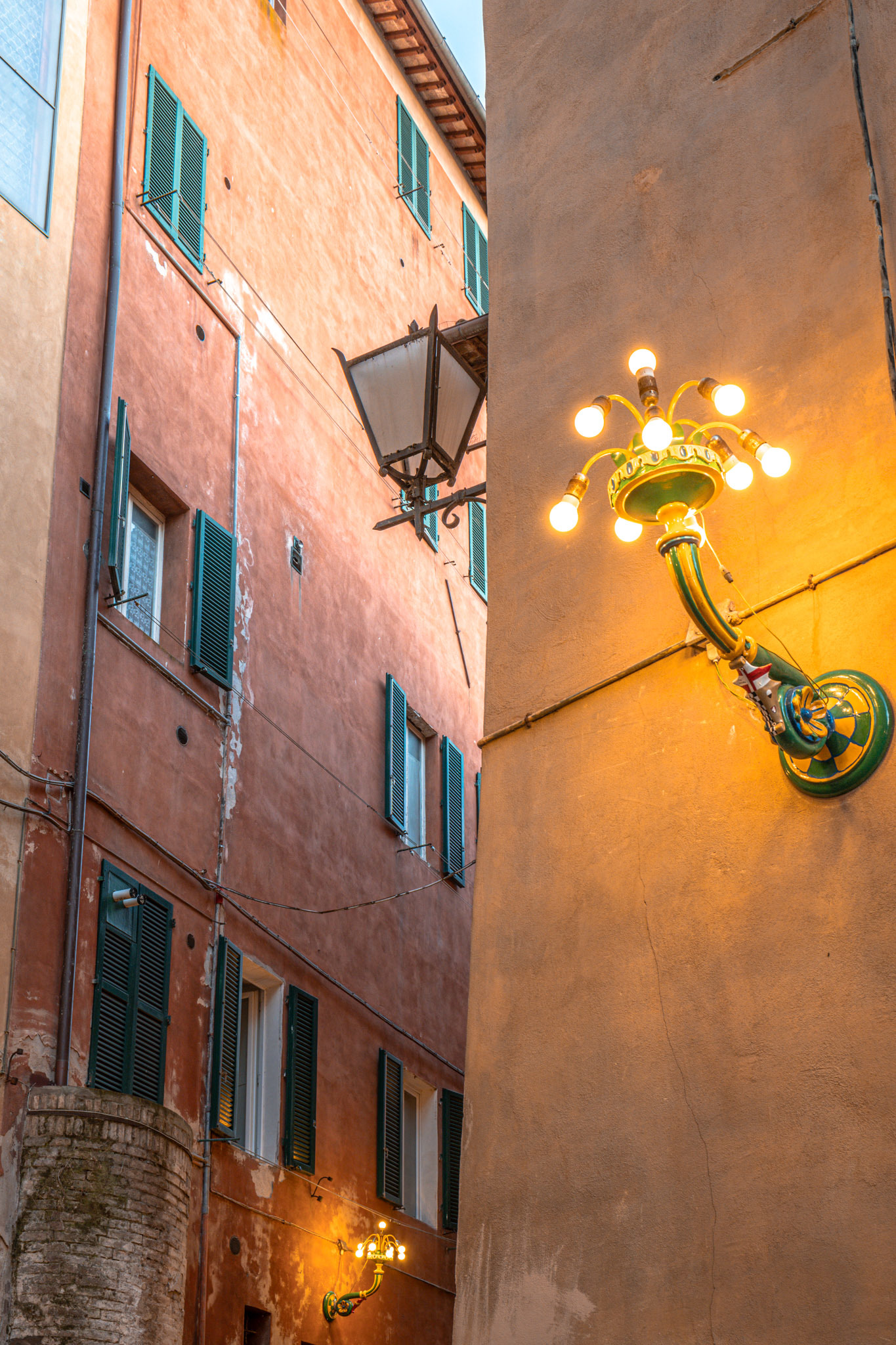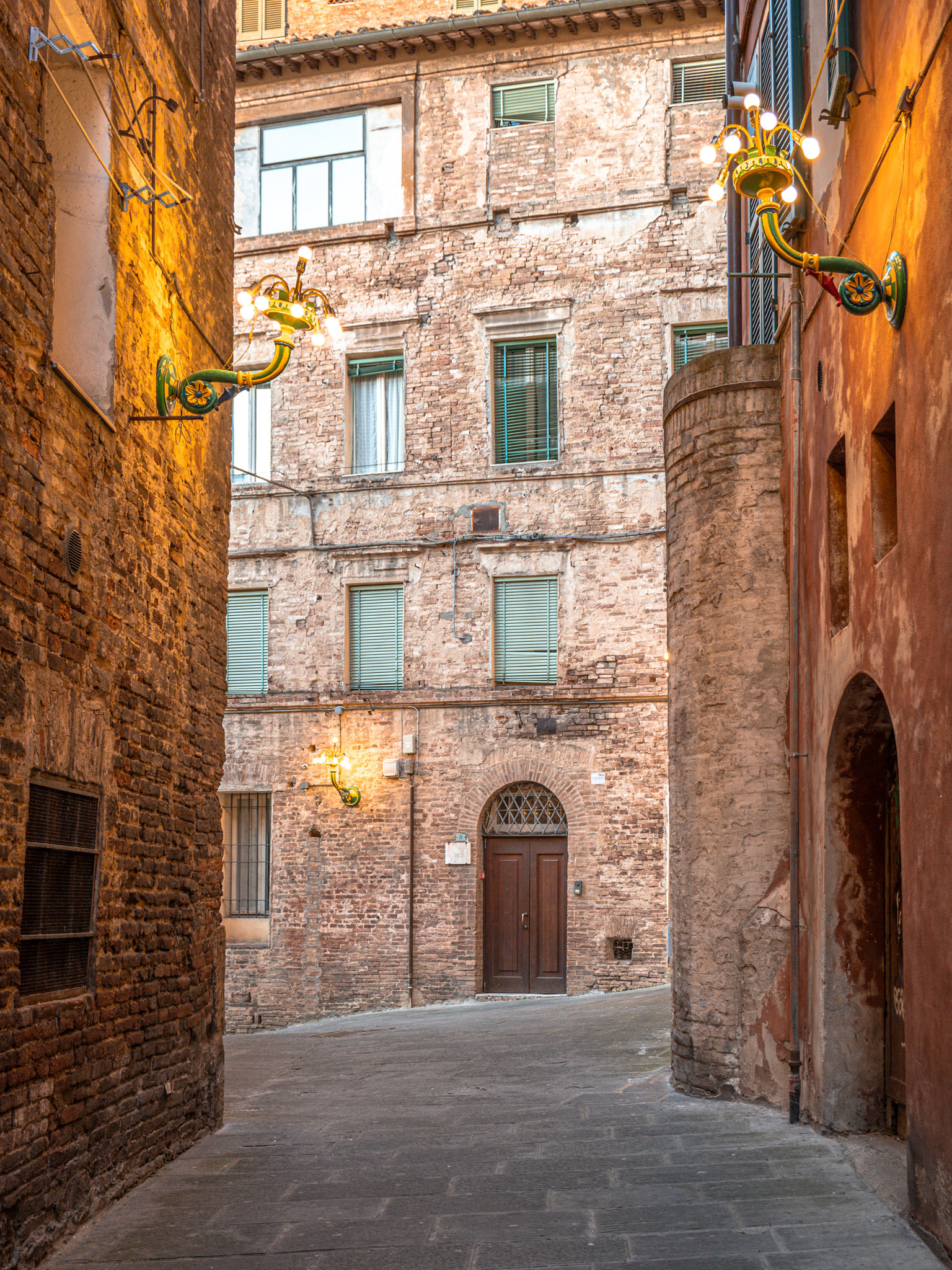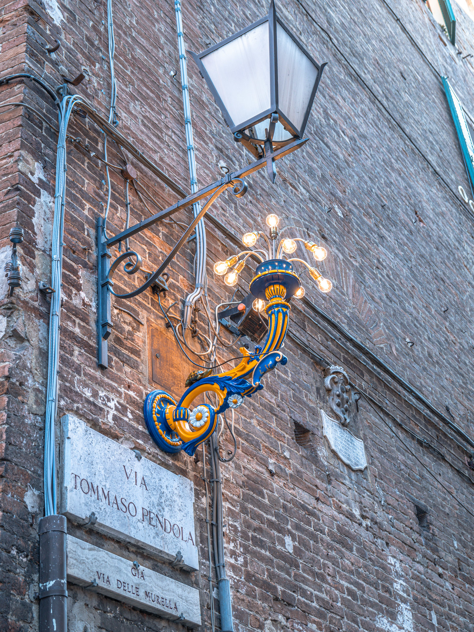 Cette rue était parfaitement photogénique en début de soirée, d’une part car elle était déserte, d’autre part car les lumières des candélabres en céramiques fixés aux façades à l’occasion du Palio lui donne un certain charme.