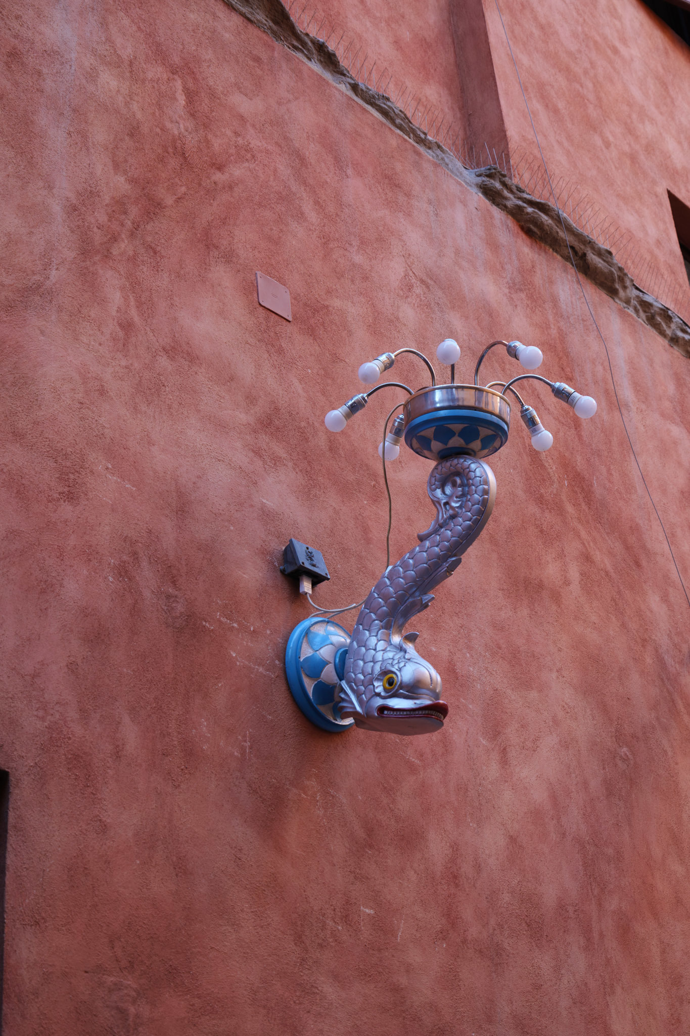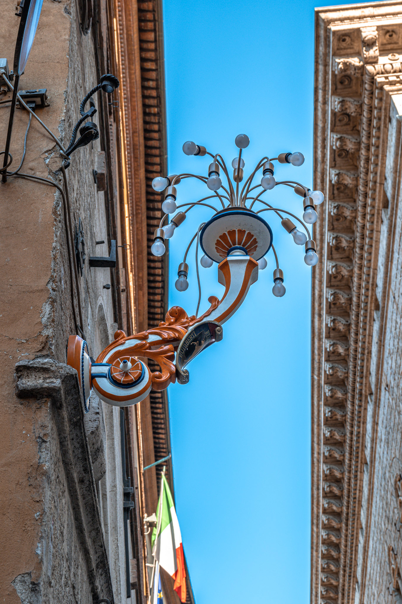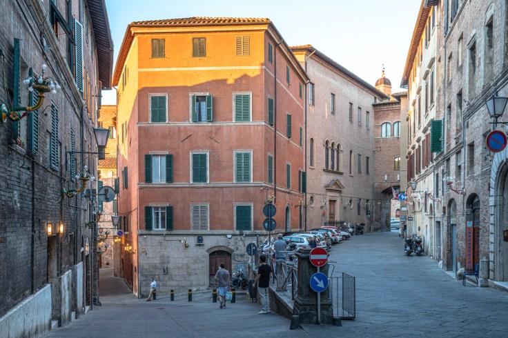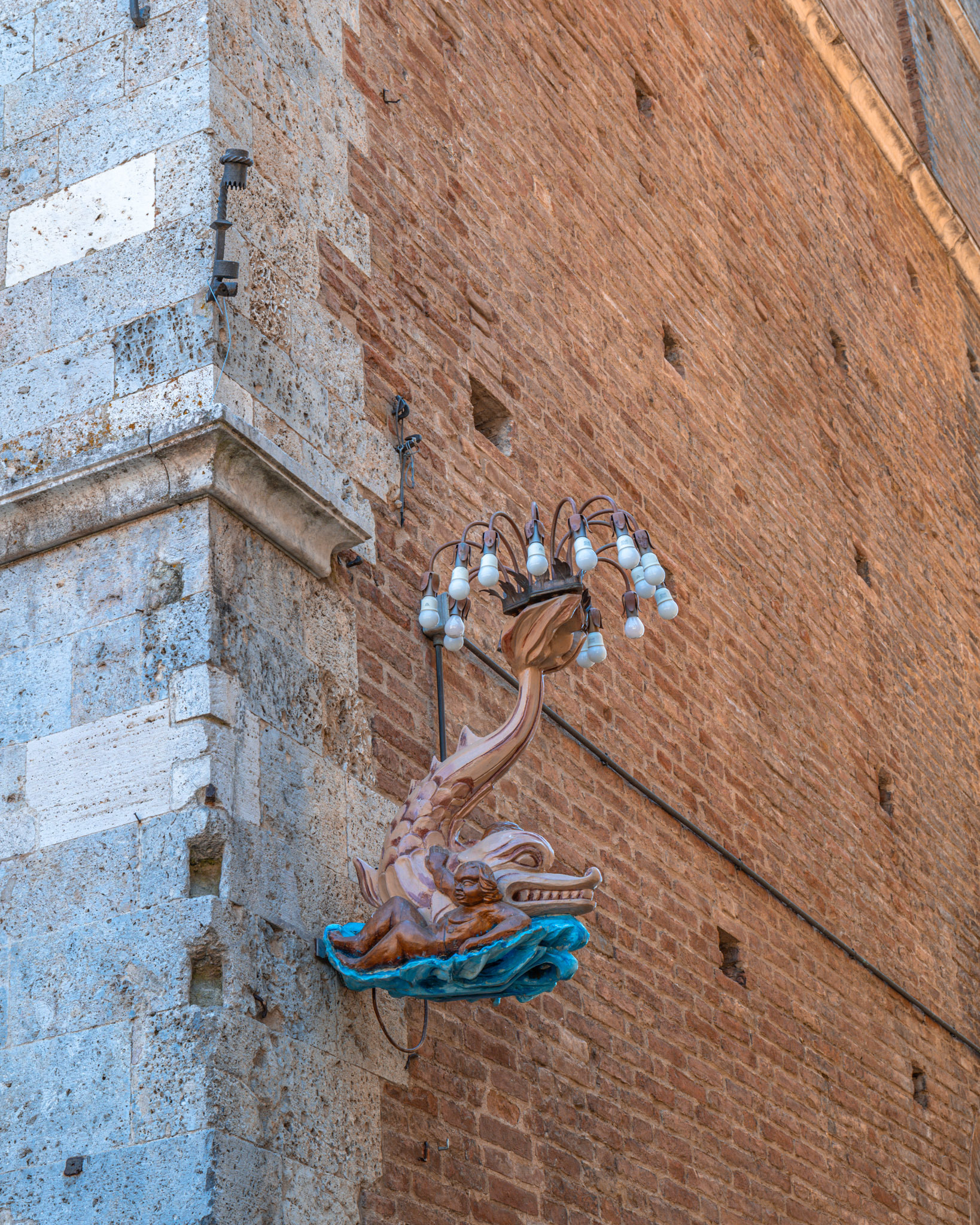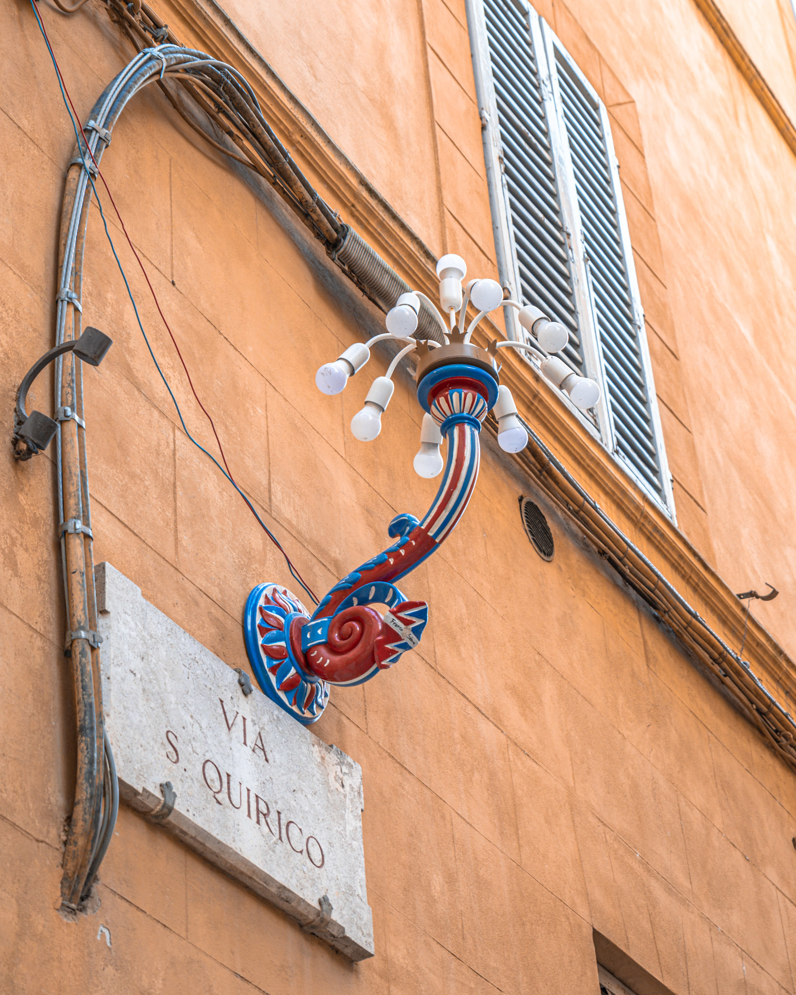 Cette rue était parfaitement photogénique en début de soirée, d’une part car elle était déserte, d’autre part car les lumières des candélabres en céramiques fixés aux façades à l’occasion du Palio lui donne un certain charme.