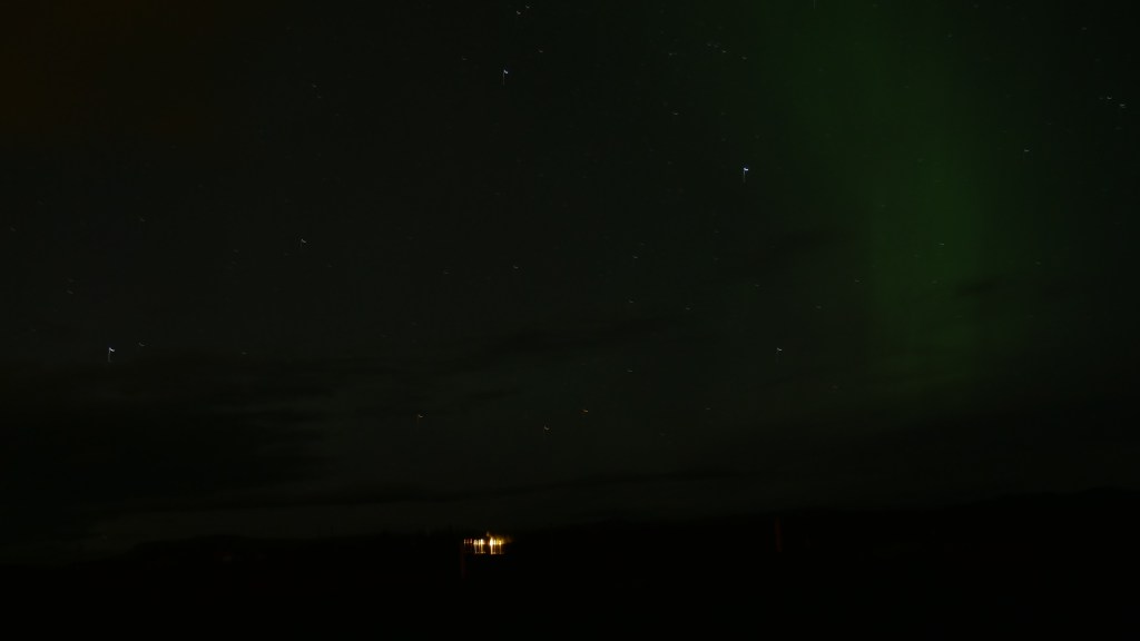 Ne vous attendez pas à voir du vert fluo au-dessus de vos têtes. C’est le fait de faire entrer de la lumière dans votre objectif qui va donner cette teinte. Je vous montre ci-dessous un cliché que j’ai modifié de manière à vous montrer ce qu’on voit réellement à l’œil nu.