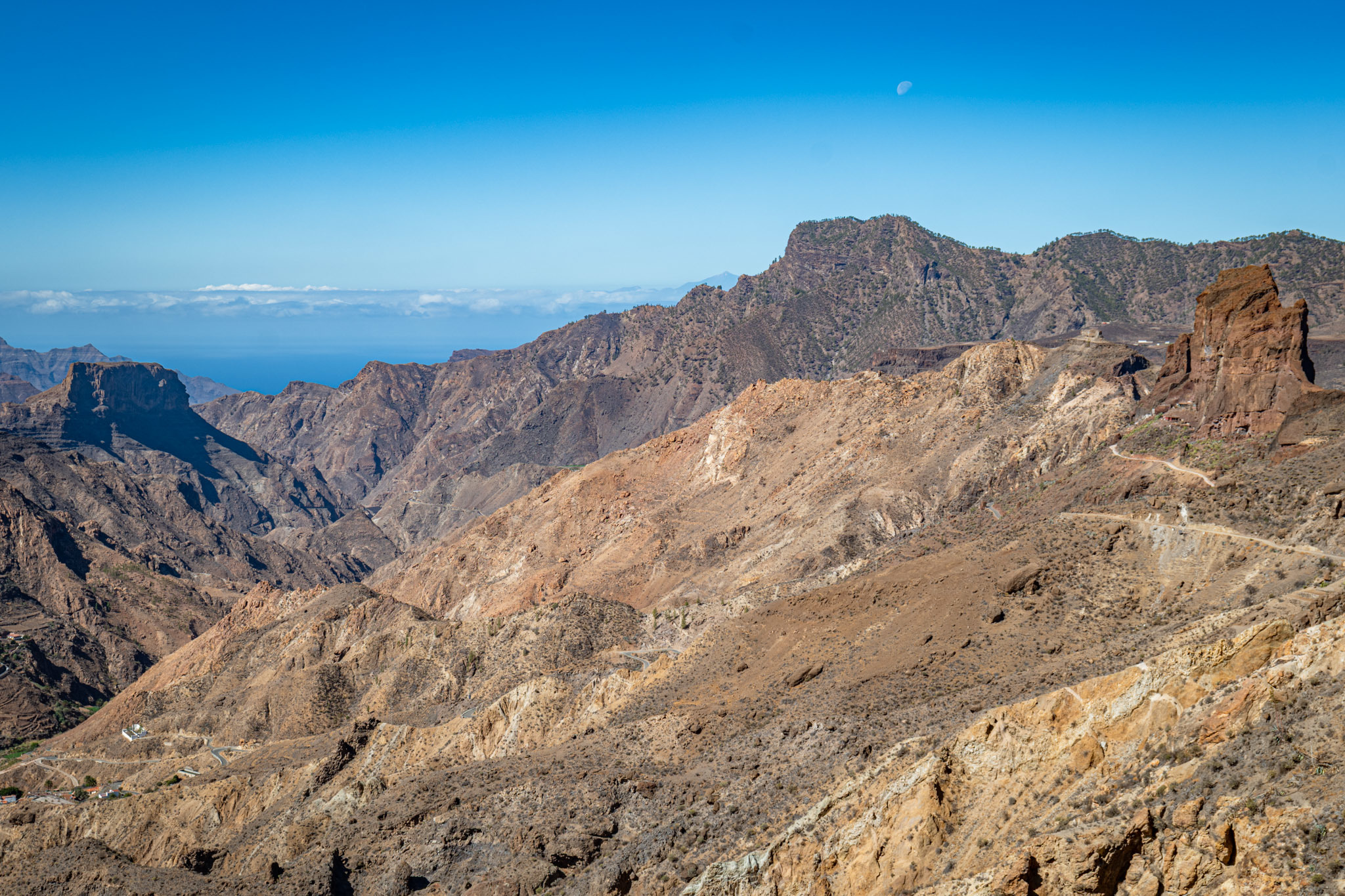 De là, vous devez parcourir quelques centaines de mètres sur la route en direction du Bentayga. Nous avons ensuite suivi à pied la route GC-671 jusqu’à l’entrée du sentier qui se situe à l’emplacement ici. J’en profite pour tirer le portrait au Bentayga une nouvelle fois, de tout près cette fois alors que les jours passés on l’avait toujours vu de loin ! On aperçoit encore la lune dans le ciel, ça donne une jolie photo !