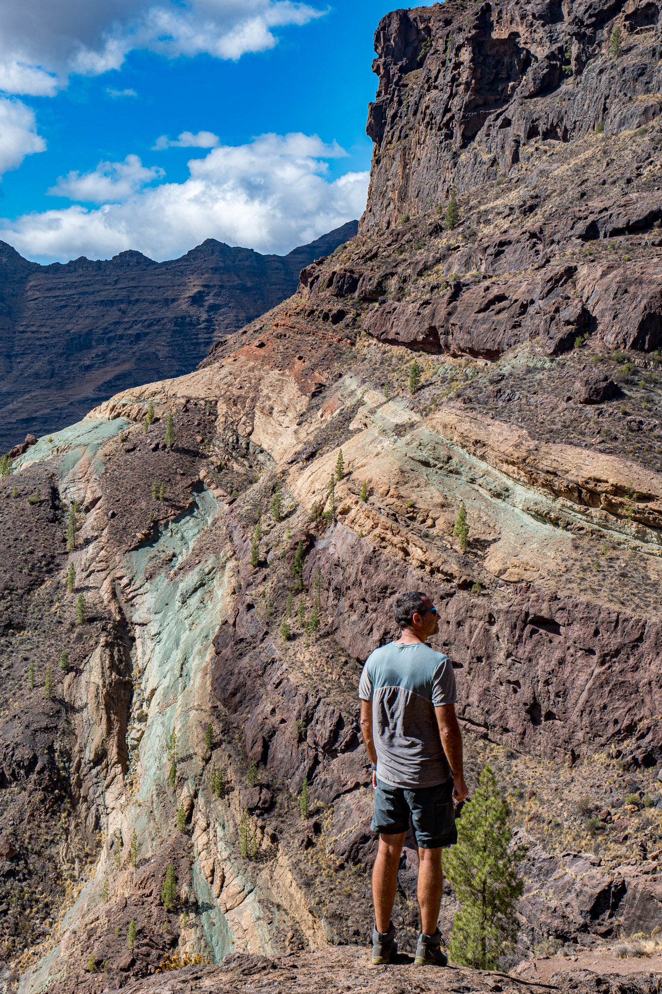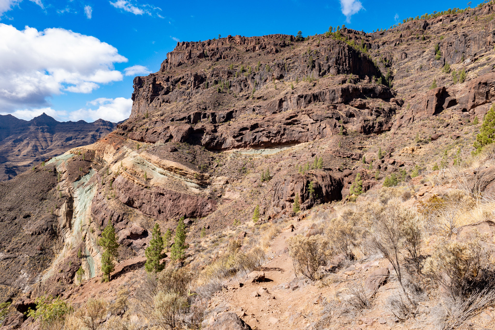 Cette randonnée est une des plus incroyables de notre séjour. Nous ne sommes pas dans la zone du Roque Nublo cette fois mais plus au sud dans le secteur de Mogan. On doit le succès de ce paysage à la roche aux couleurs étonnantes qui borde la route.