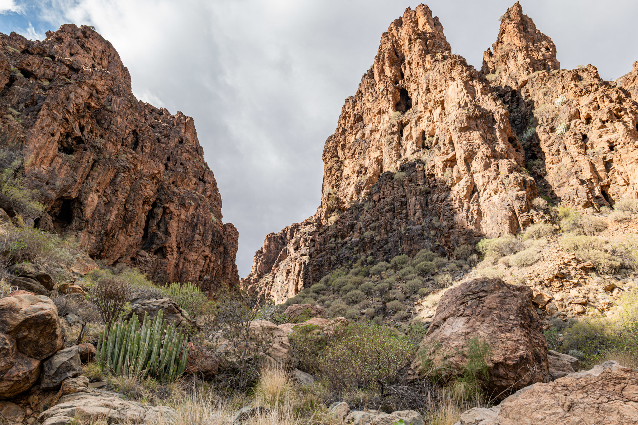 Durant les derniers jours de notre séjour, on ne savait plus vraiment où randonner. Nous avions vu tout ce qu’on voulait voir dans le secteur du Roque Nublo, du Bentayga, et de tout le secteur du centre de l’île. Le Viking a trouvé cette rando complètement en dehors des sentiers battus et je dois dire que même si elle a mal commencé (le chemin d’entrée longe une carrière et c’est vraiment très très laid) et qu’il a mal terminé avec une lourde chute pour moi dans les derniers kilomètres, cette rando a été absolument fantastique et avec des paysages de gorges époustouflants !