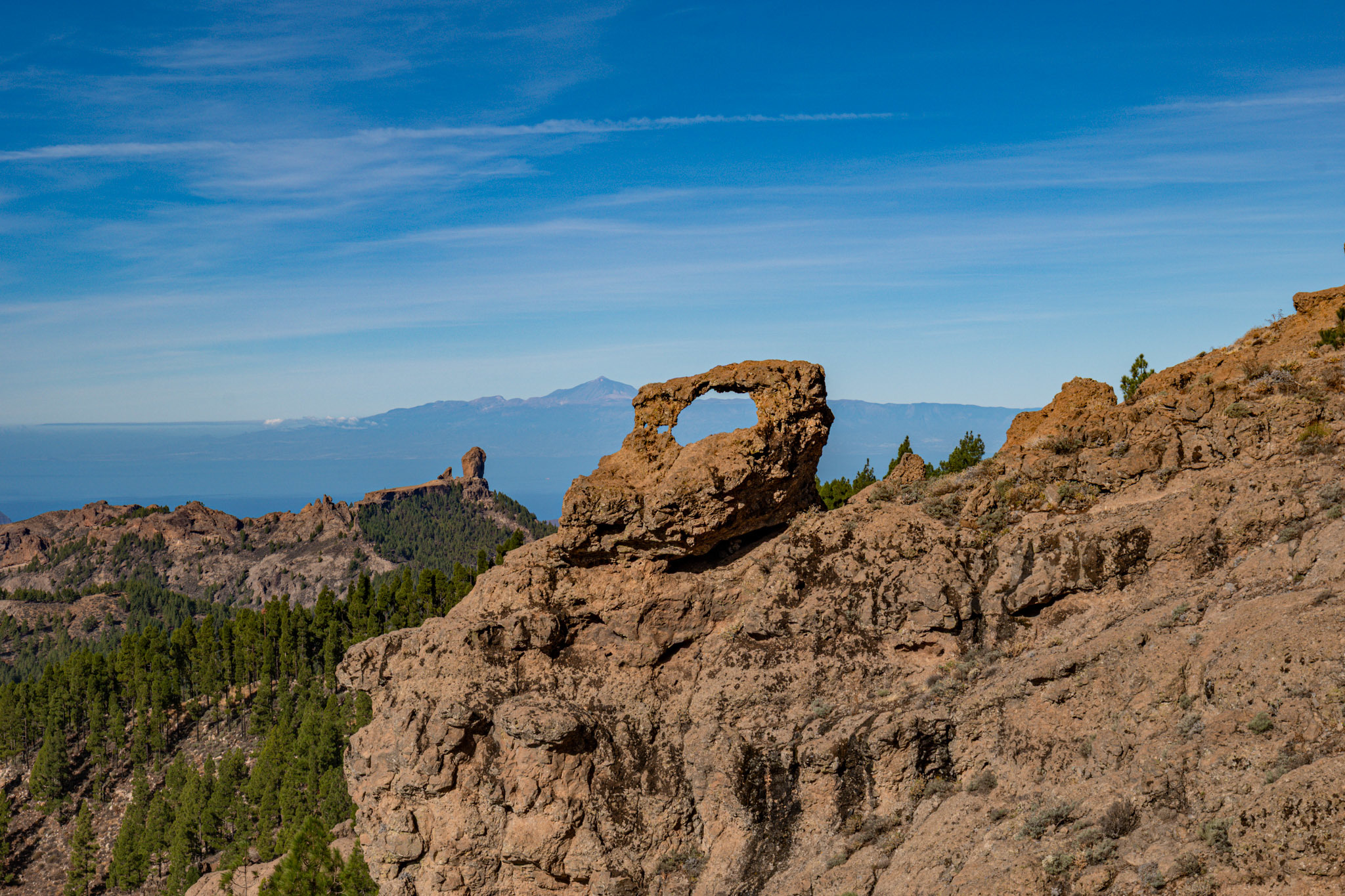 Depuis le Roque Bastón, il est possible de rejoindre, en quelques minutes de marche, une arche spectaculaire située un peu plus loin. Difficile de faire plus photogénique : selon l’angle de prise de vue, le Roque Nublo apparaît parfaitement centré dans l’ouverture de l’arche, avec en arrière-plan le volcan Teide, à Ténérife qui semble si proche !